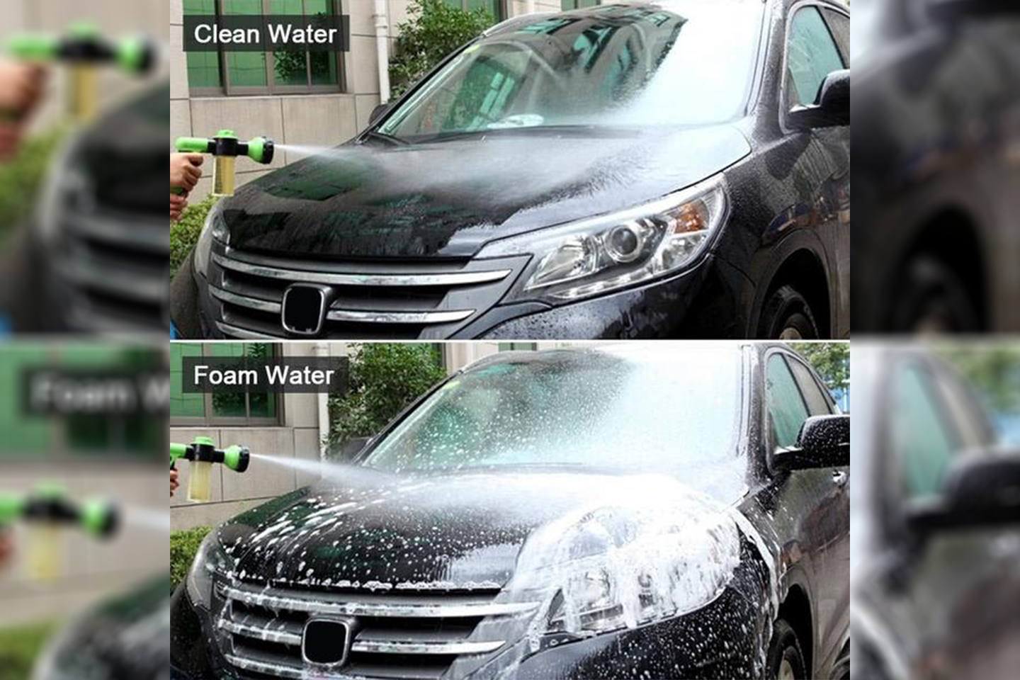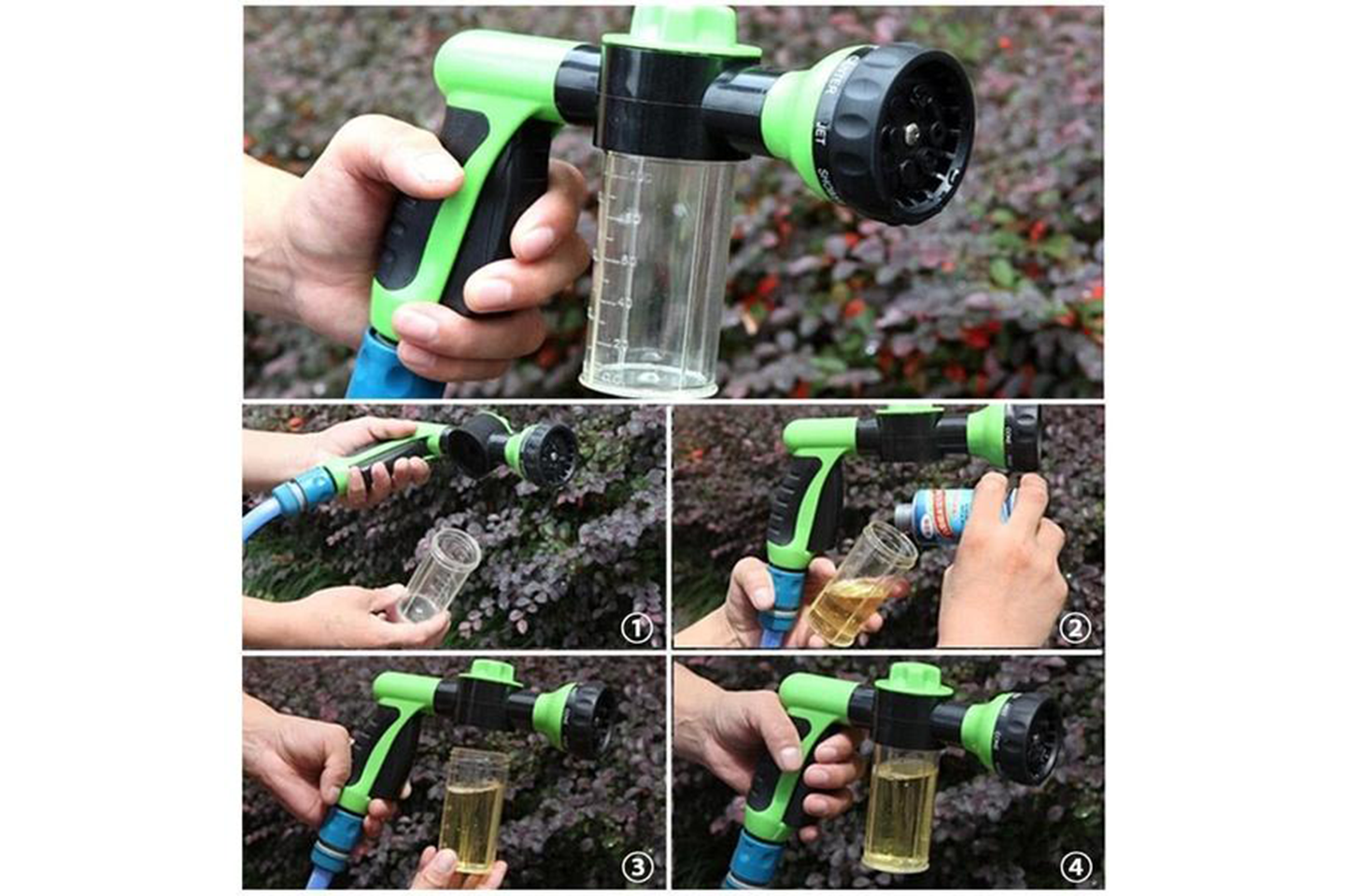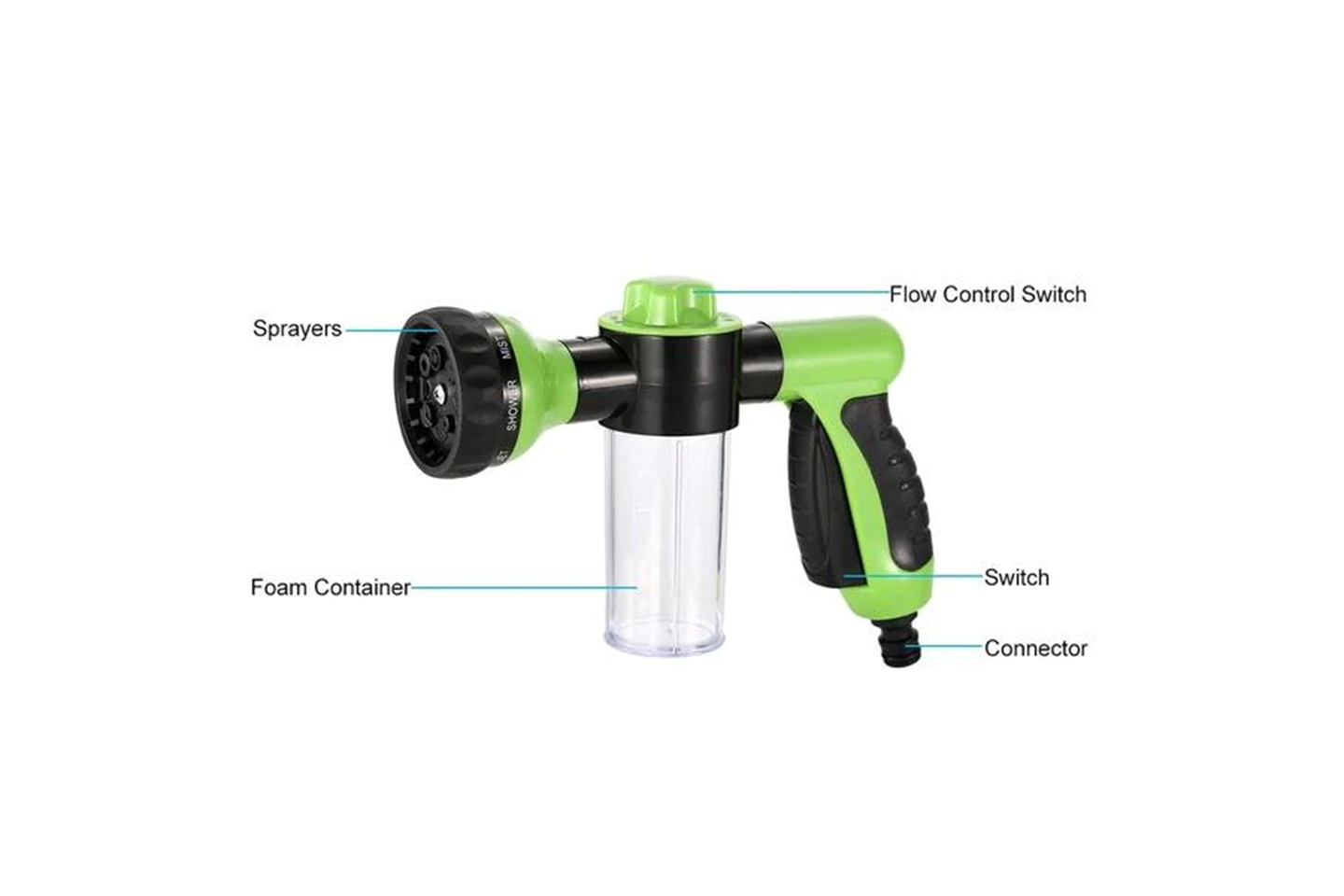 Skumvannspyleren er et praktisk verktøy for å vaske bilen, motorsykkelen eller hjemmerengjøringformål. Den har flytkontroll og 8 forskjellige sprayer, avtakbart design, og enkelt grep.
