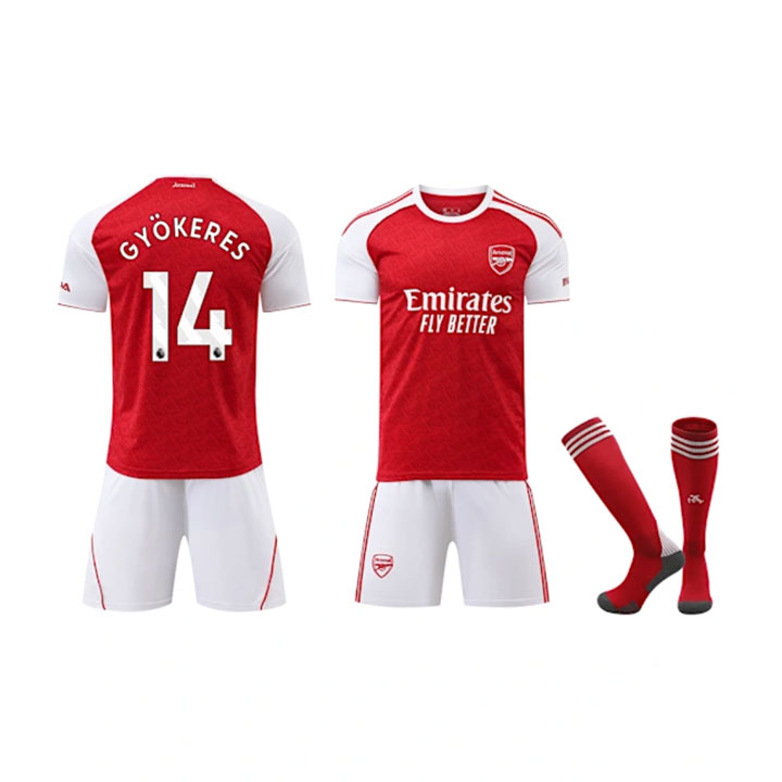 Kampdrakt i rødt og hvitt, inspirert av fotballstjernene på banen. Fotballdrakt, fotballshorts og sokker er laget av slitesterk polyester.