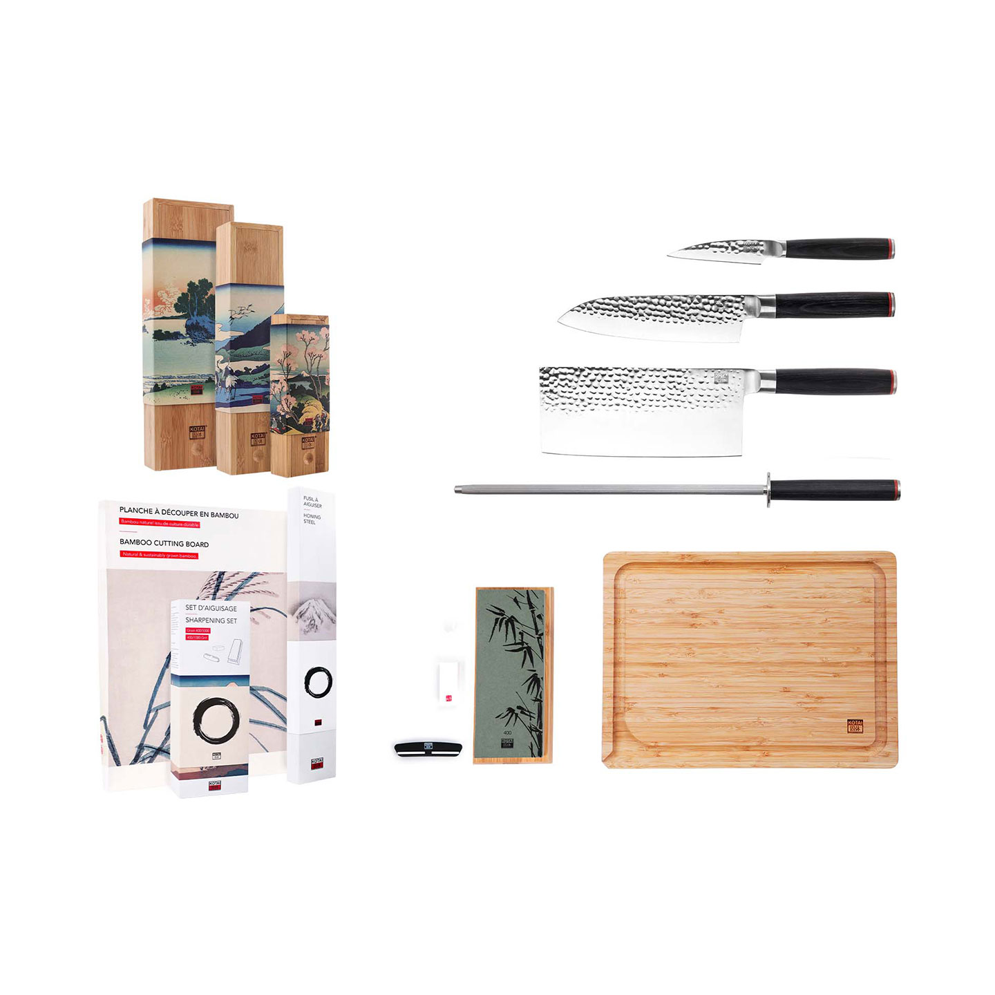The Asian Set Deluxe Edition inkluderer: Skrellekniv, Santoku universalkniv, Kjøttøks, Slipestål, Slipesett med tosidig bryne og Bambusskjærebrett.