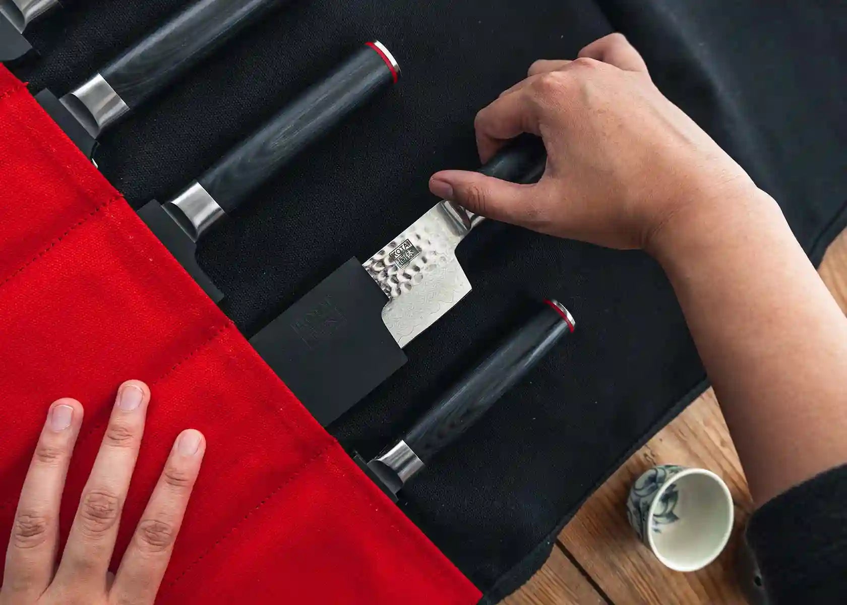 Sammenrullbar og håndlaget med tykk 473g bomull, er denne Kotai-reiseknivvesken laget for å vare og følge kokker gjennom hele karrieren. Opptil 6 kniver og et slipestål er beskyttet av den tykke bomullen og innerfôret, og de holdes sikkert for å sikre at de forblir trygge under transport. Sporene inni vesken er laget for å passe til de forskjellige knivene med Saya på, inkludert kjøttøksen (Kotai sin bredeste kniv). Enkel å åpne og lukke med et knytesystem; inkluderer en klaff for ekstra beskyttelse og 2 håndtak for sikker, oppreist transport.