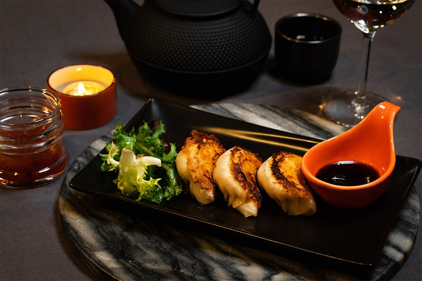 3 stk stekte Dumpling fylt med finhakket svinekjøtt og grønnsaker, serveres med soya-chilisaus.
