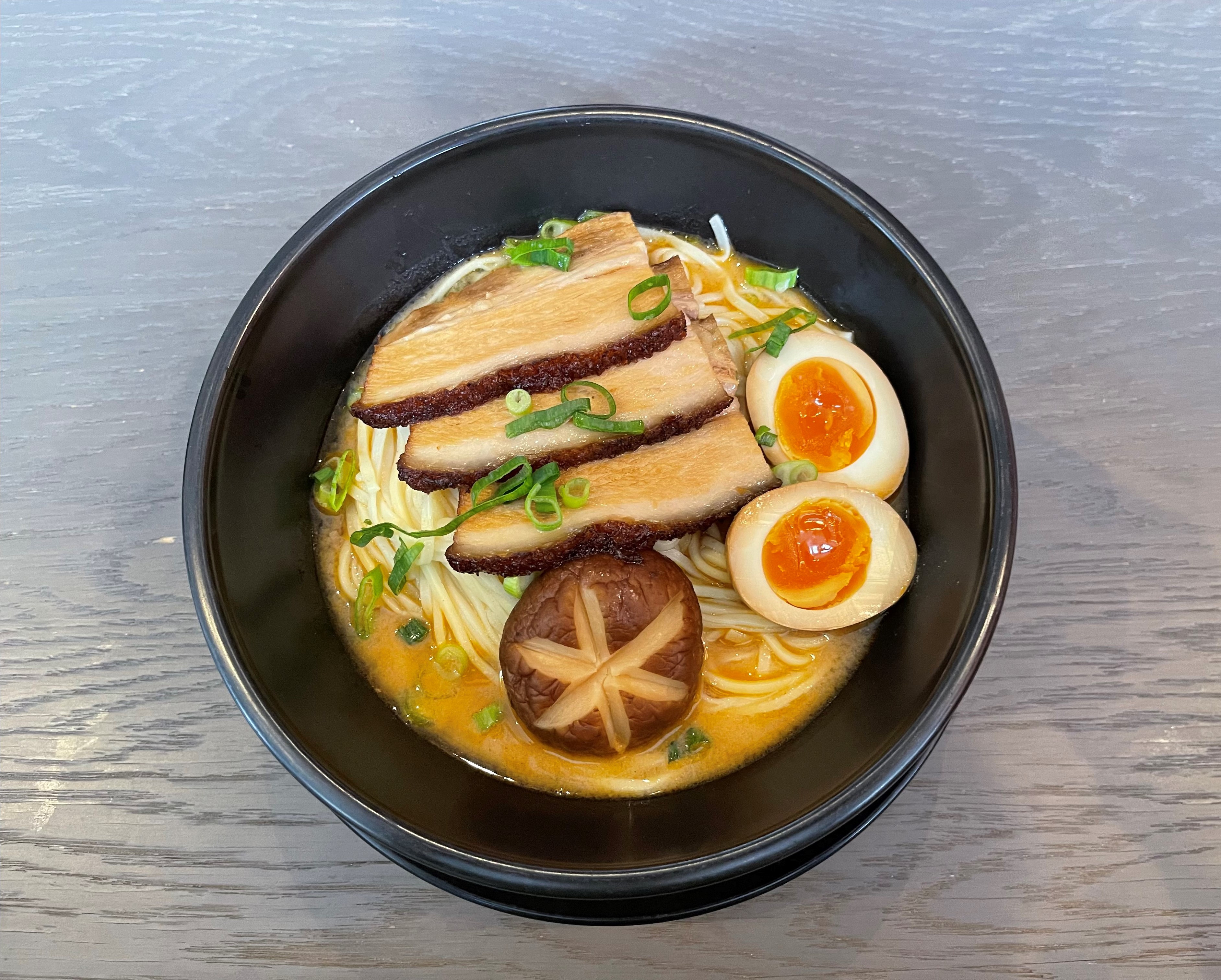 Smakfull Miso Ramen med skiver av langtidsbraisert Svineribbe, egg, sopp og vårløk.