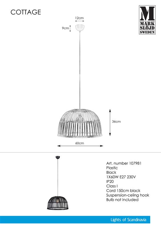 Cottage taklampe fra Markslöjd. Stor, svart pendel med en diameter på 60 cm. 1,5 m svart kabel. Monteres med takkrok. Maks 1x60W. E27 stikkontakt.