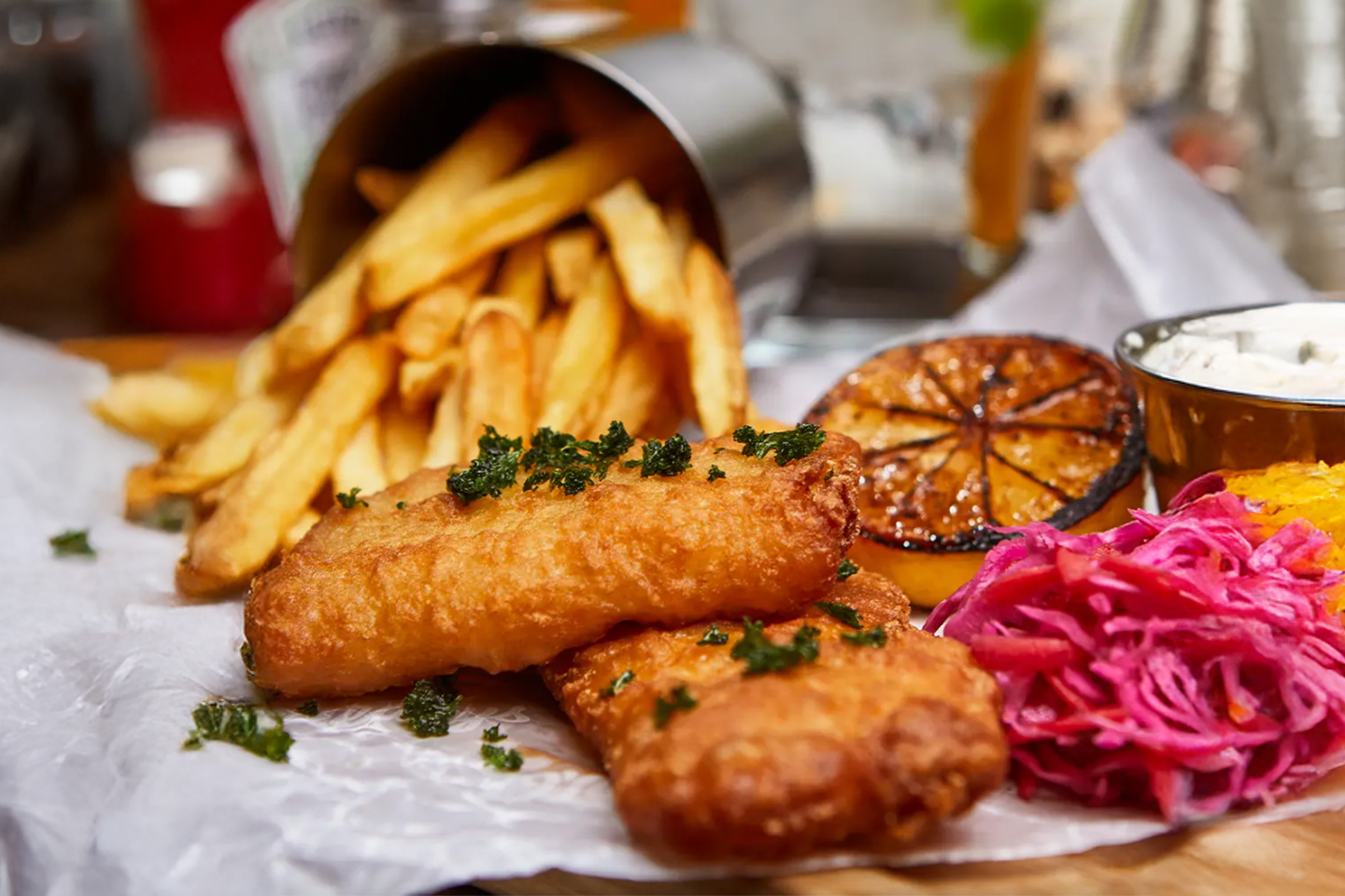 Fritert torskefilet toppet med fritert persille. Serveres med tartarsaus, grillet sitron, jalapeño pickled slaw og pommes frites. - CHICKEN QUESADILLAS & FRENCH FRIES