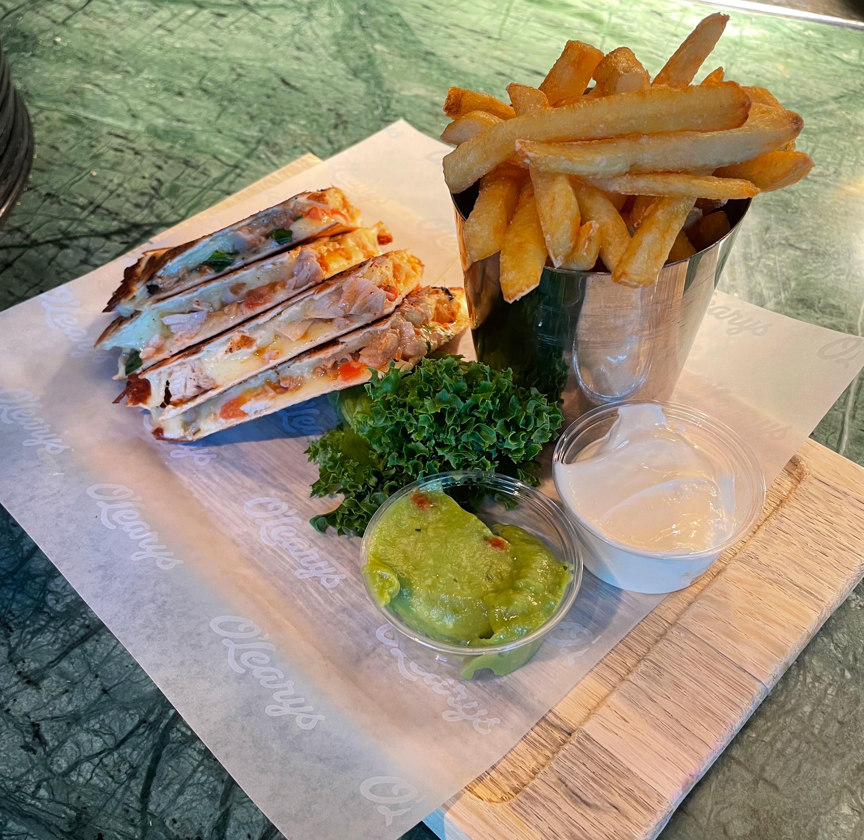 Tortillalefse med pulled chicken, pico de gallo og smeltet mozarella & cheddar. Serveres med guacamole, rømme og pommes frites.