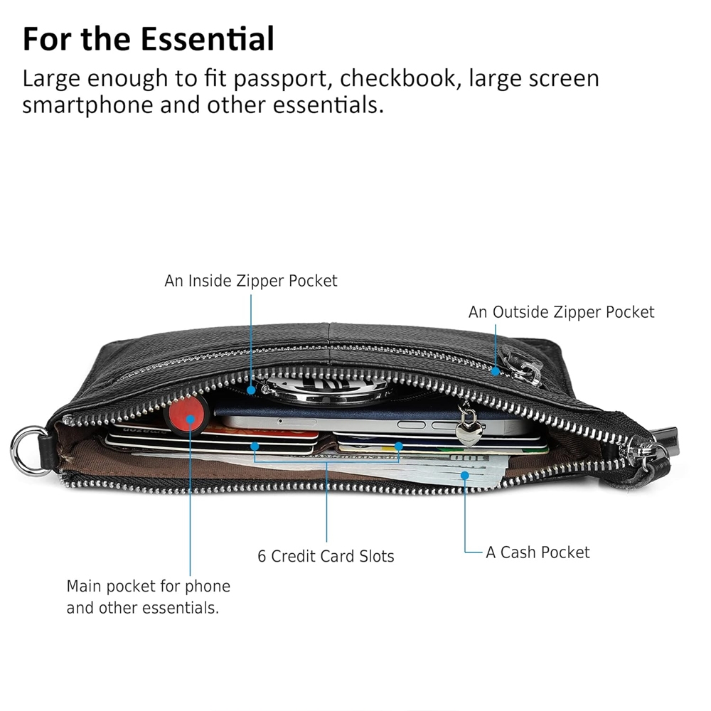 Hendig skinnveske med skulderreim og plass til det viktigste. Vesken har plass til lommebok, mobiltelefon, sminke, servietter, nøkler og mindre reiseartikler.