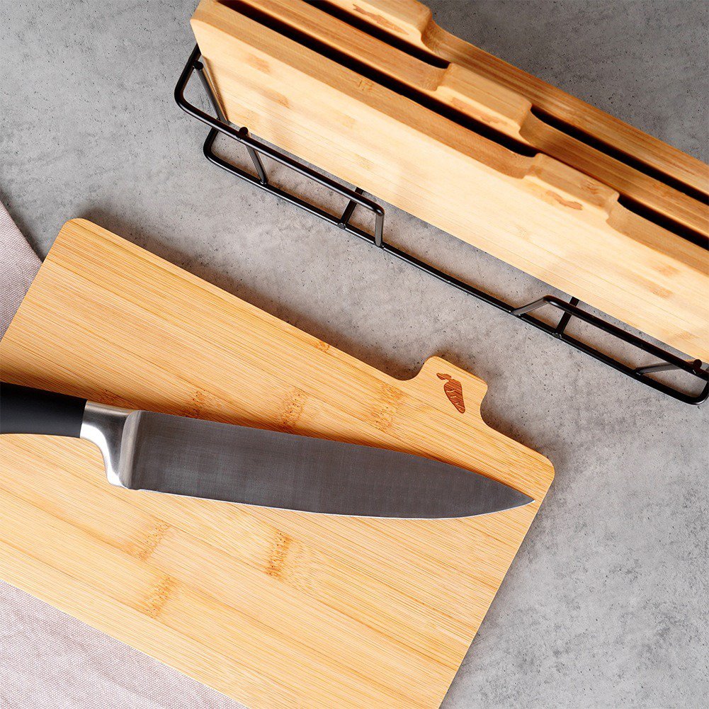 - Bruk: Skjærebrett for ulike matvarer med stativ til oppbevaring