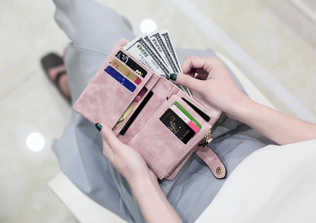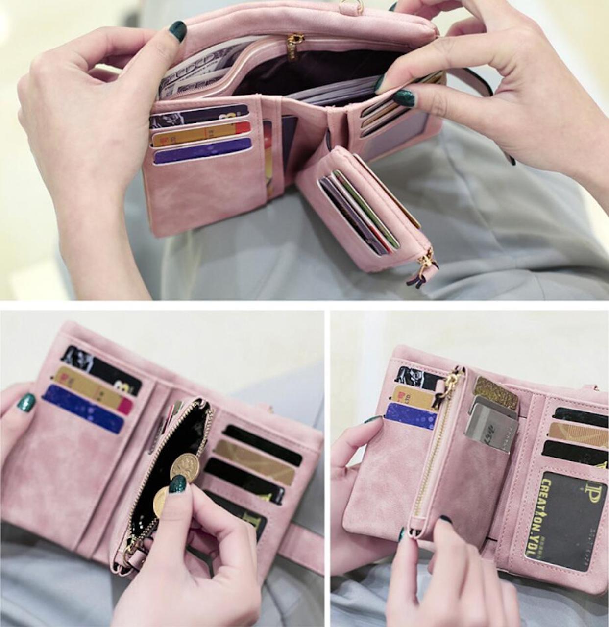 et stort seddelrom, elleve kortplasser, spor med vindu for for eksempel førerkort/ID, fire rom for papir/visitkort, to rom for sedler, papir og mynter med glidelås