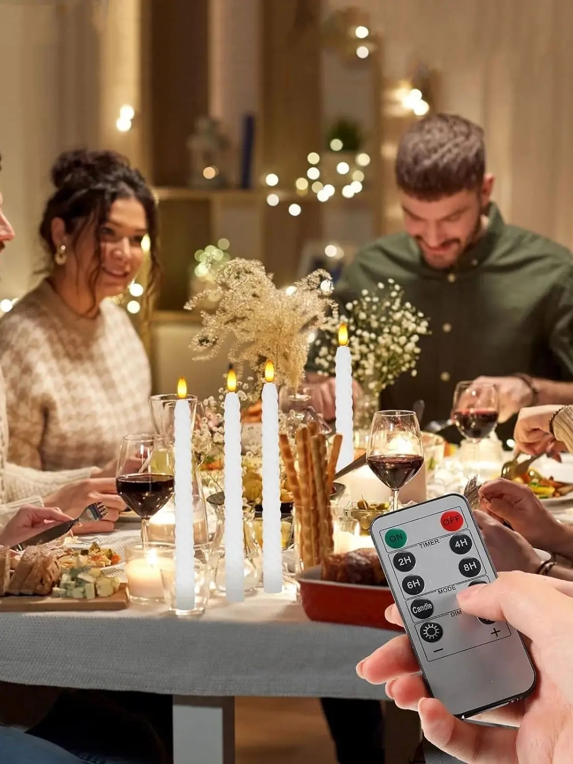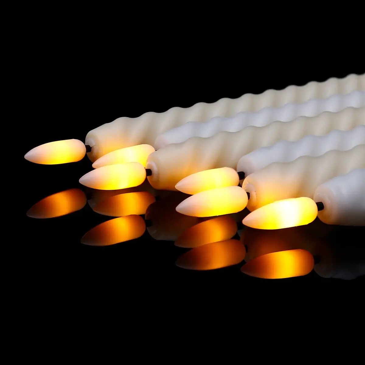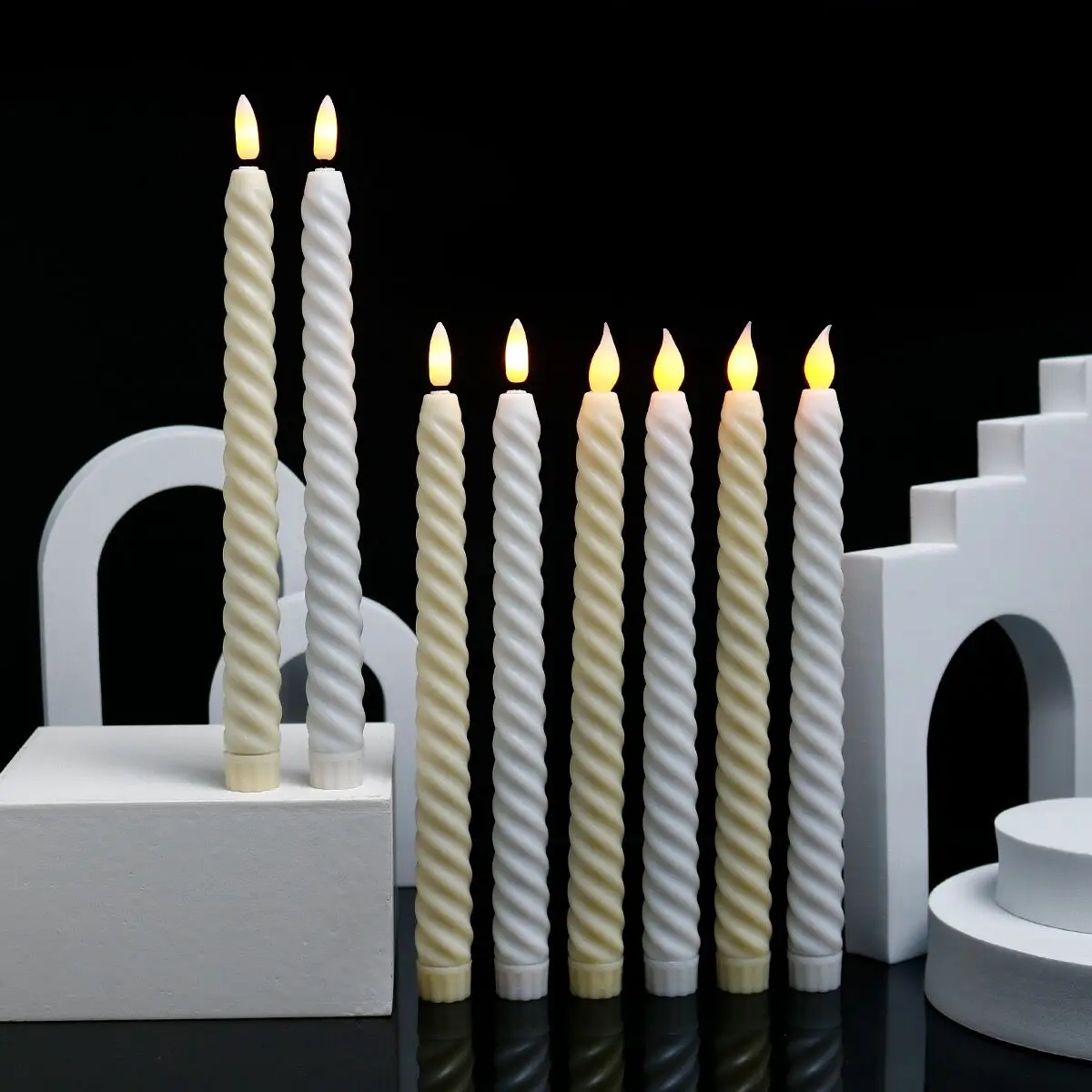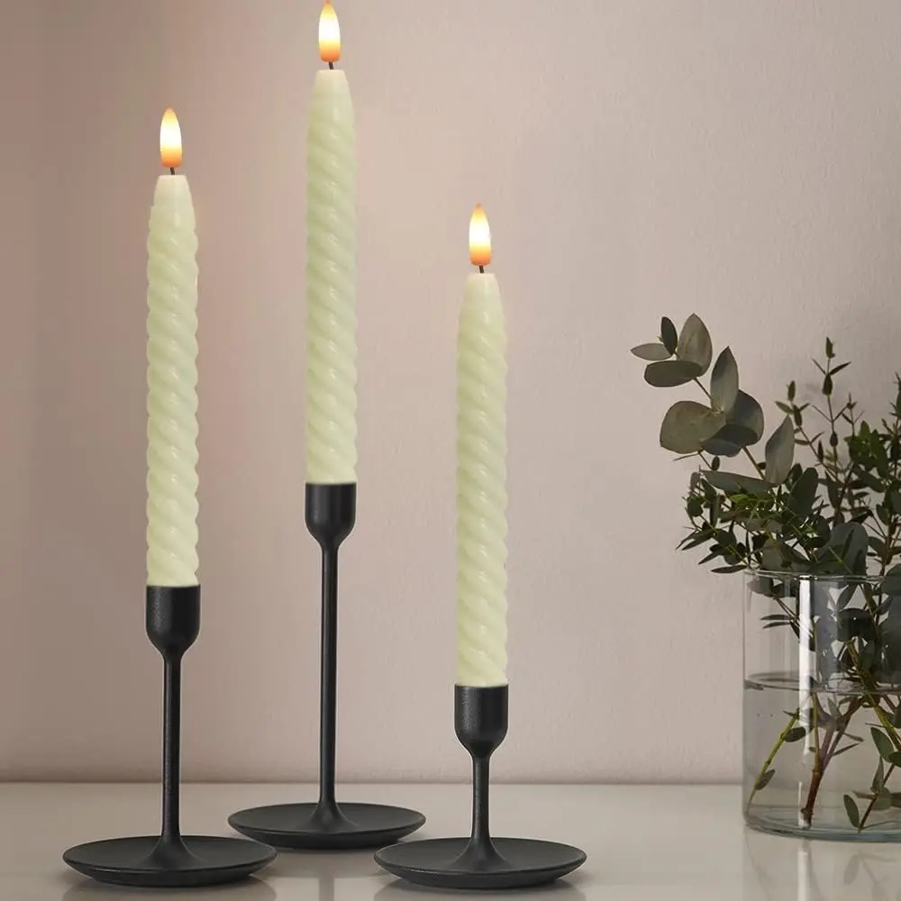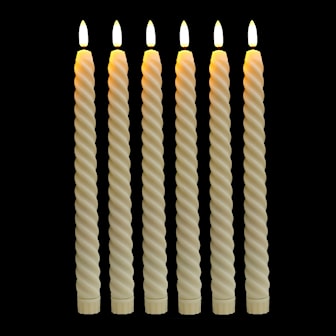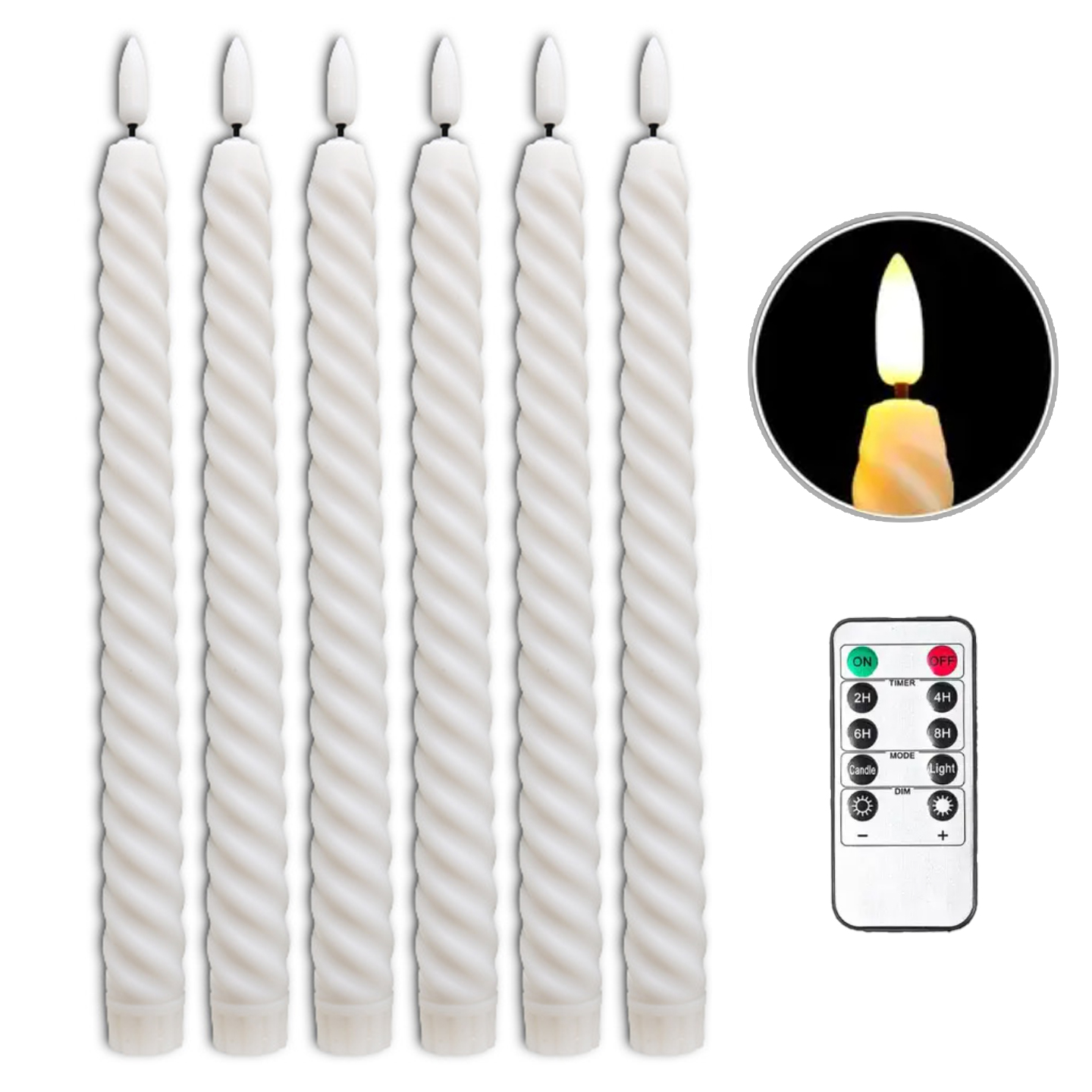 Flammefrie flimrende lys i spiraldesign med fjernkontroll. Blitseffekten gjør at disse LED-lysene ser ut som ekte lys. Du kan plassere dem i de aller fleste standard lysestaker. Med fjernkontrollen kan du justere lysstyrken etter ønske, samt du kan stille inn lyset til å tennes i 2, 4, 6, 8 timer.