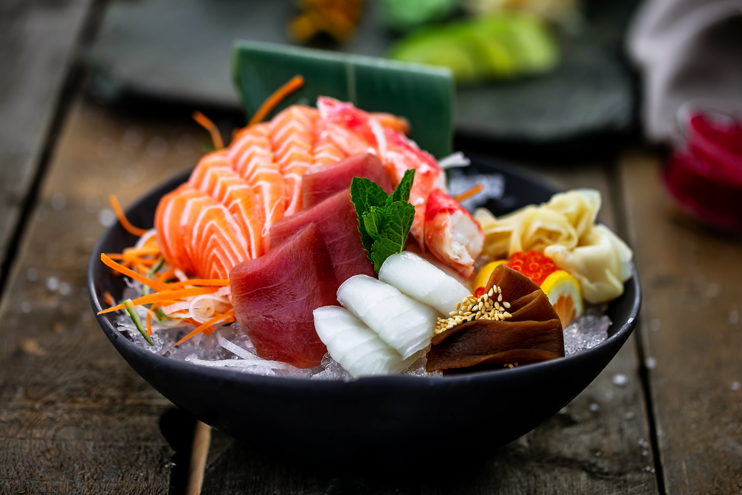 Philadelphia Roll (8 biter), Nigiri Laks (2 biter), Sashimi Laks (2 biter).