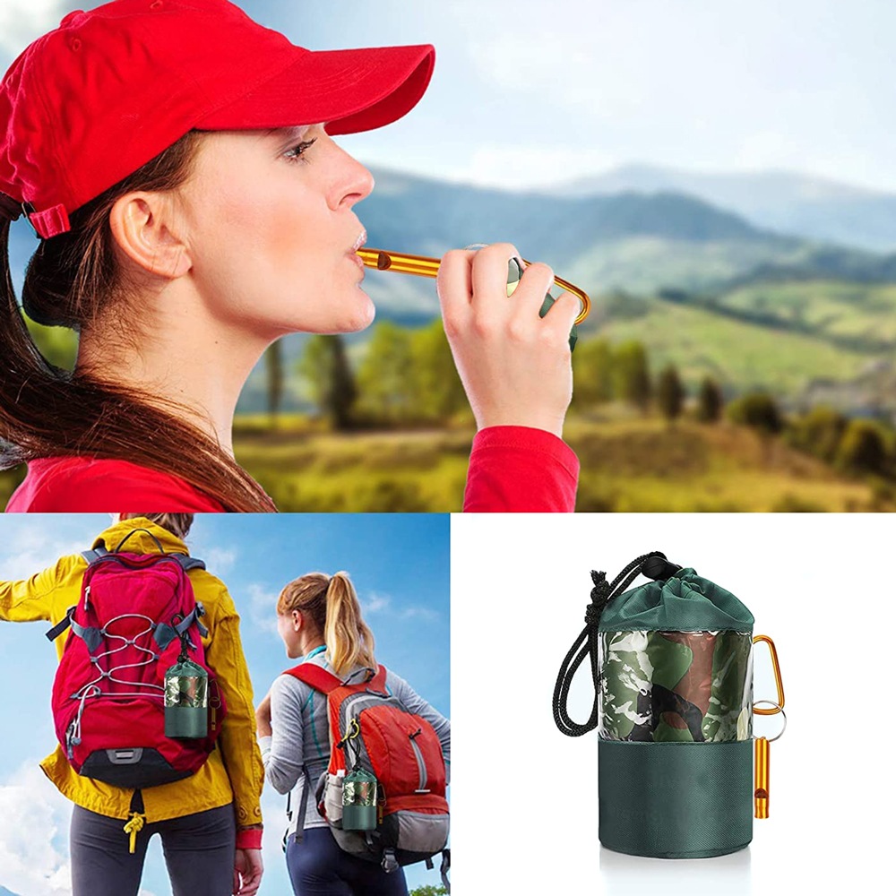 - Pakken inkluderer: overlevelsesteppe, oppbevaringspose, karabinkrok, fløyte