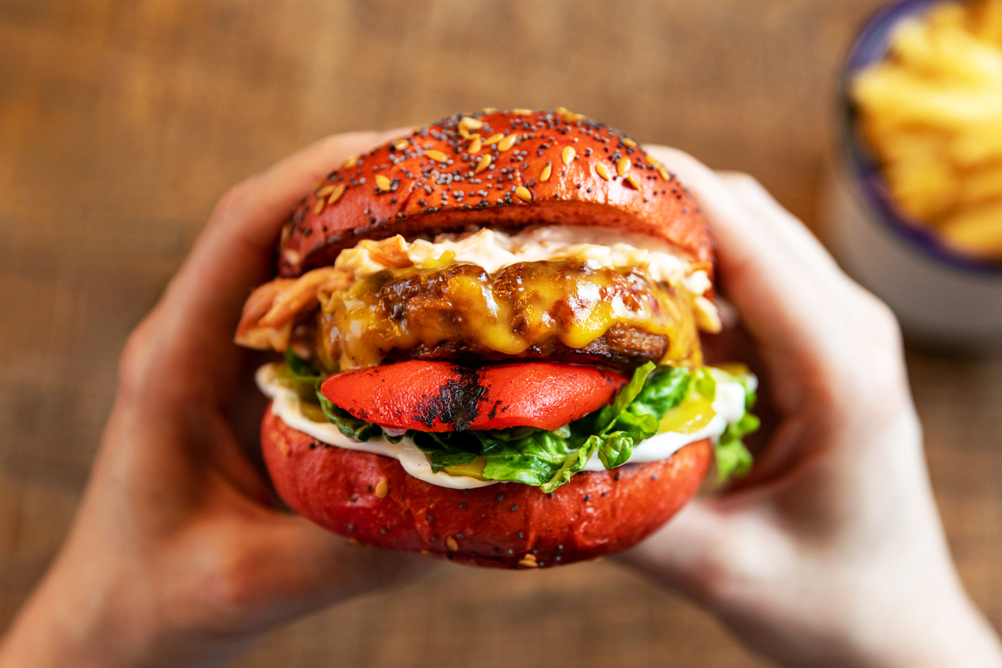Beyond meat patty, vegan cheddar cheese, crispy kale, sun-blushed tomato chutney & hummus on a brioche style bun. - BEYOND BURGER