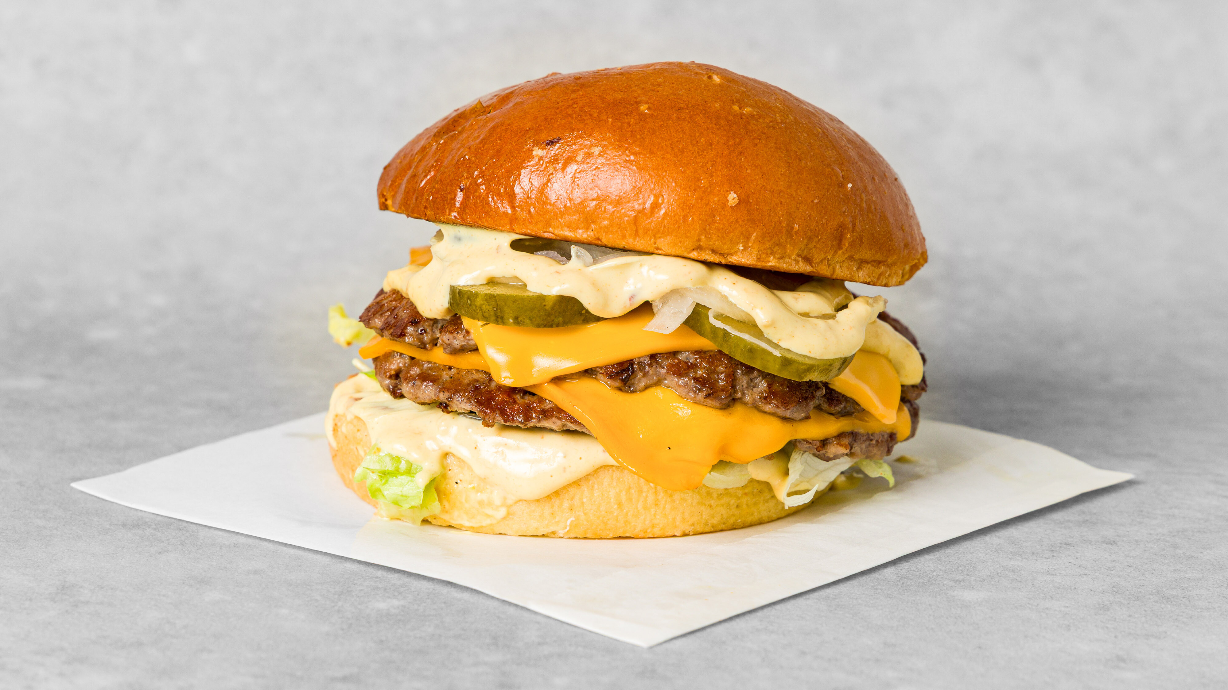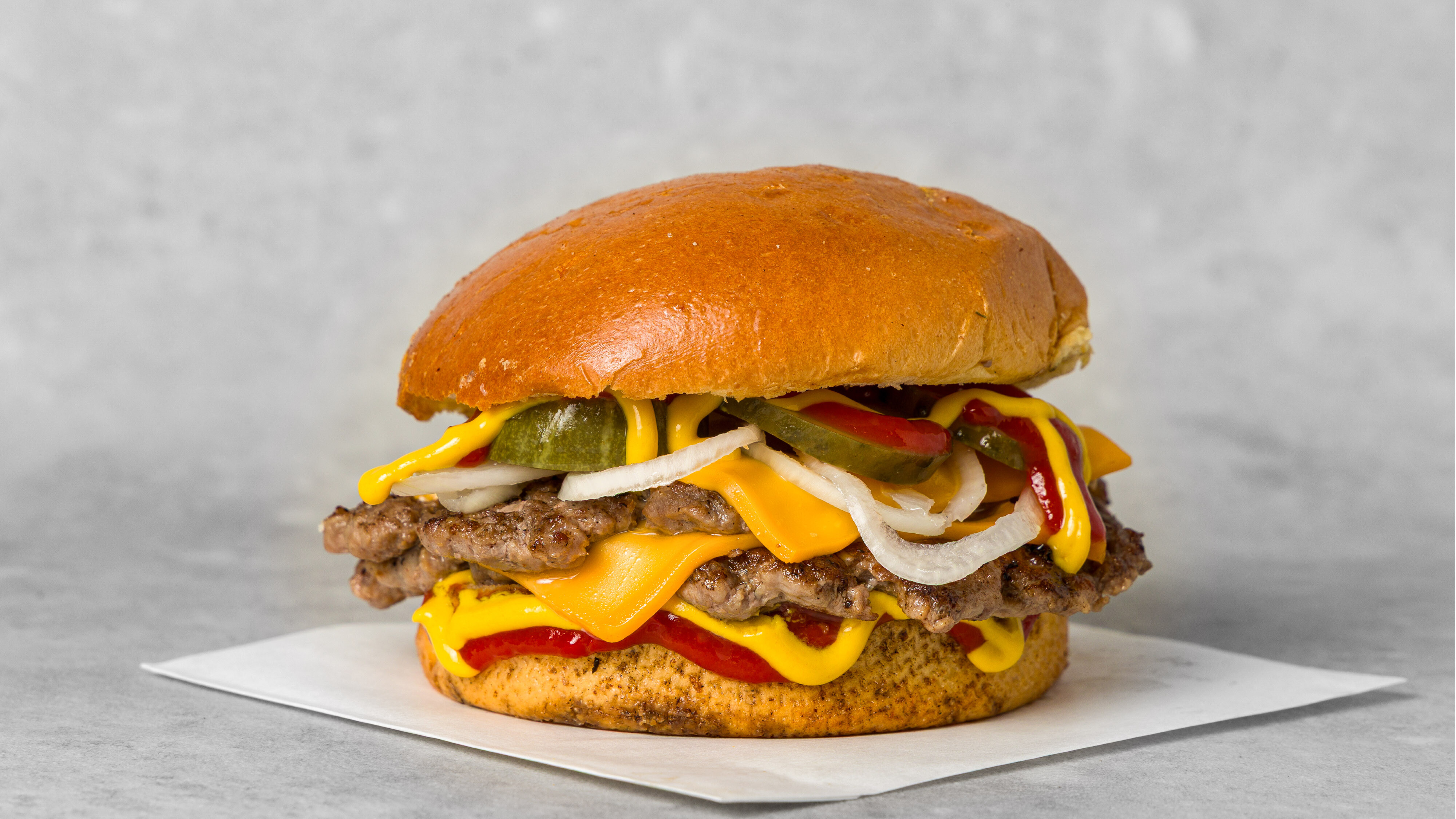 2x smashed oksekjøtt, dobbel cheddarost, løk, syltet dillagurk, ketchup og sennep på briochebrød.
