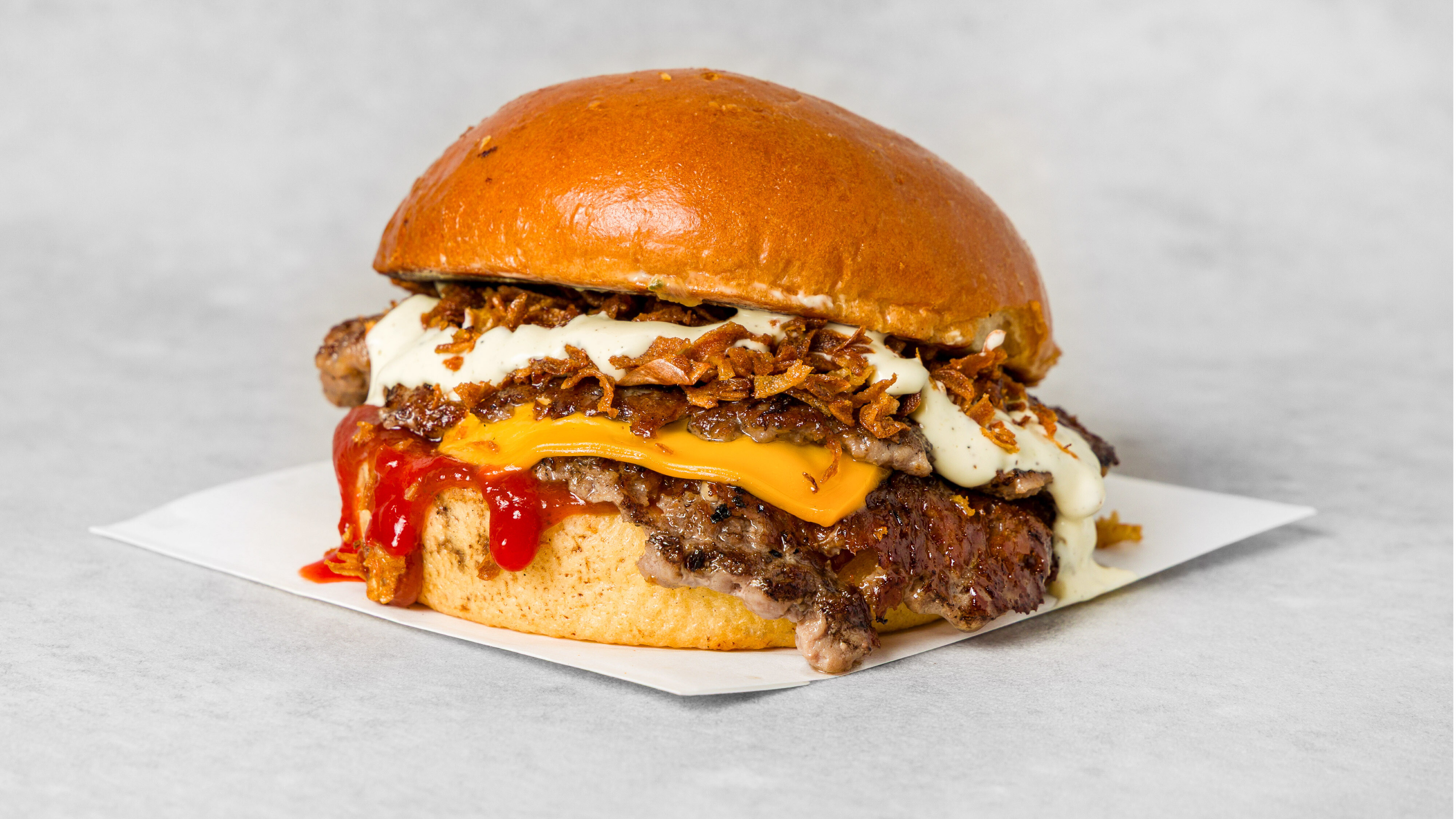 2x smashed oksekjøtt, dobbel cheddarost, BBQ-saus, majones, sprøstekt løk og ristet briochebrød. - Double Cheeseburger Deluxe