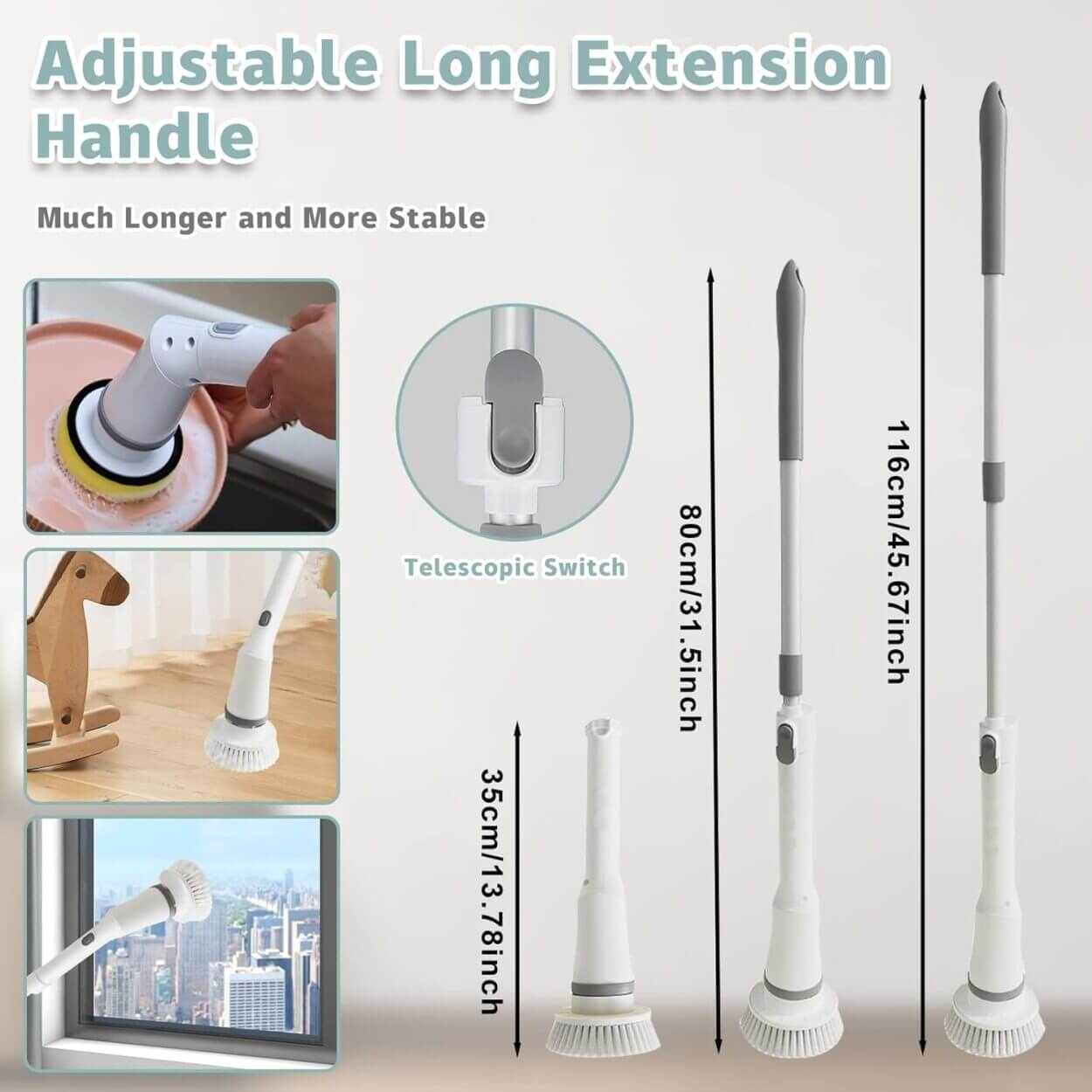 Lei av å skrubbe og gni uten å få de resultatene du ønsker? Oppdag vår elektriske rengjøringsbørste med teleskophåndtak som gjør rengjøring til en lek! Med sin smarte 3-seksjonsdesign og justerbare lengde mellom 35-110cm, når du enkelt alle vanskelig tilgjengelige flater og hjørner.