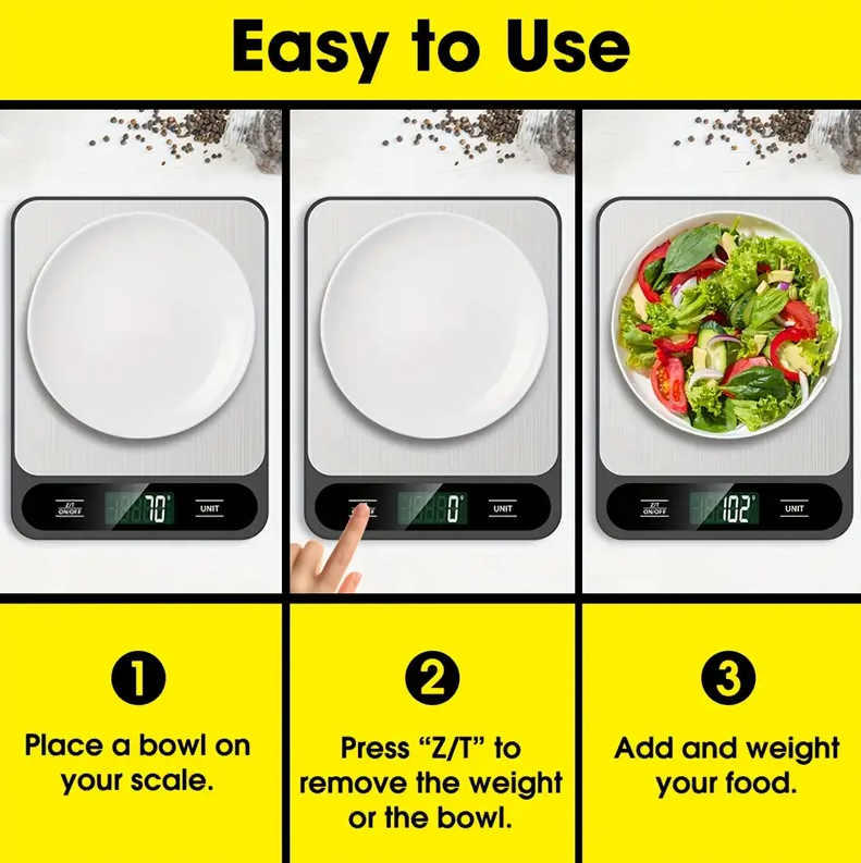Få presise resultater på kjøkkenet med en digital kjøkkenvekt som kan håndtere opptil 10 kg med en presisjon på 1 g. Vekten har 6 enheter (g, kg, lb, oz, ml, ml for væske), et tydelig LCD-display og en praktisk tarafunksjon som nullstiller vekten av boller og beholdere.