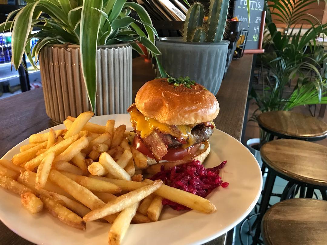 200 g høyrygg kjøtt, bacon, syltet rødløk, syltet agurk, salat, tomat, ost og husets dressing. Kommer med potet brød og steakhouse fries. - Hot N' Spicy Burger