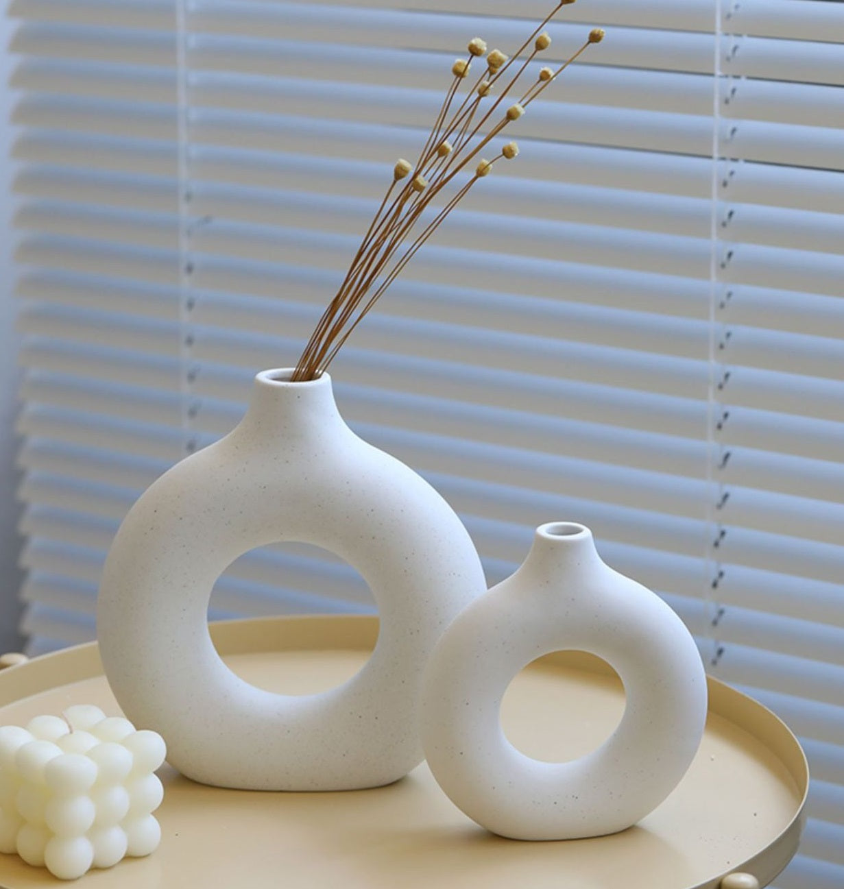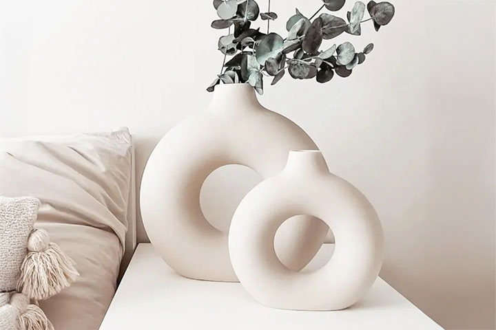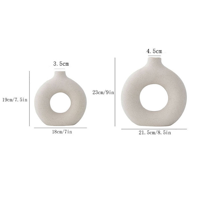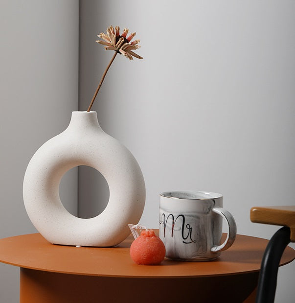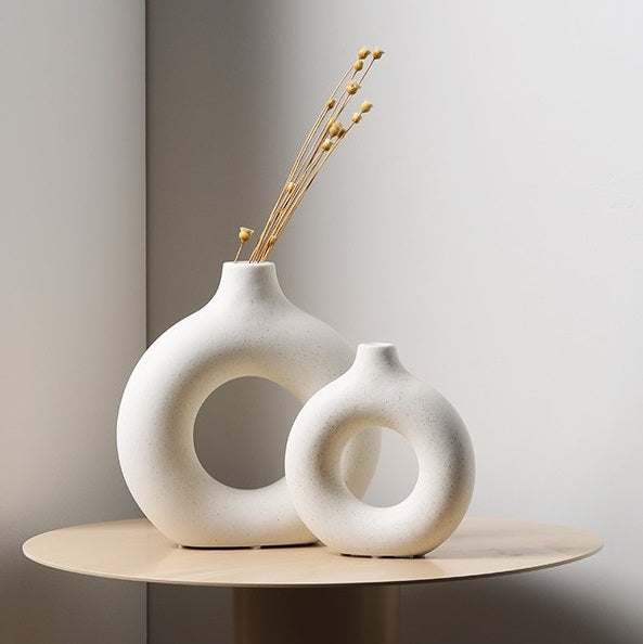 En stilig vase i hvit keramikk med ringformet design. Passer like godt som pynt i en bokhylle som på spisebordet med noen enkle kvister.