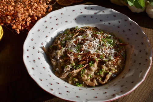 Frityrstekt risottokule med italiensk salsiccia, cheddar, parmesan, aioli og persille. (A,C,G,L)