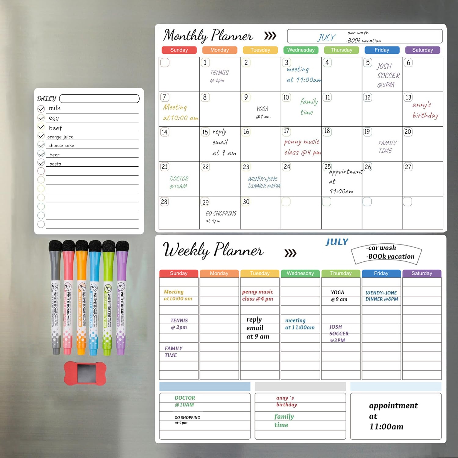 Måneds-, uke- og dagsplanlegger i magnetisk tavlemateriale. Perfekt for å organisere skolearbeid og familieaktiviteter. Kan enkelt plasseres på kjøleskapet eller annen magnetisk overflate. Inkluderer
