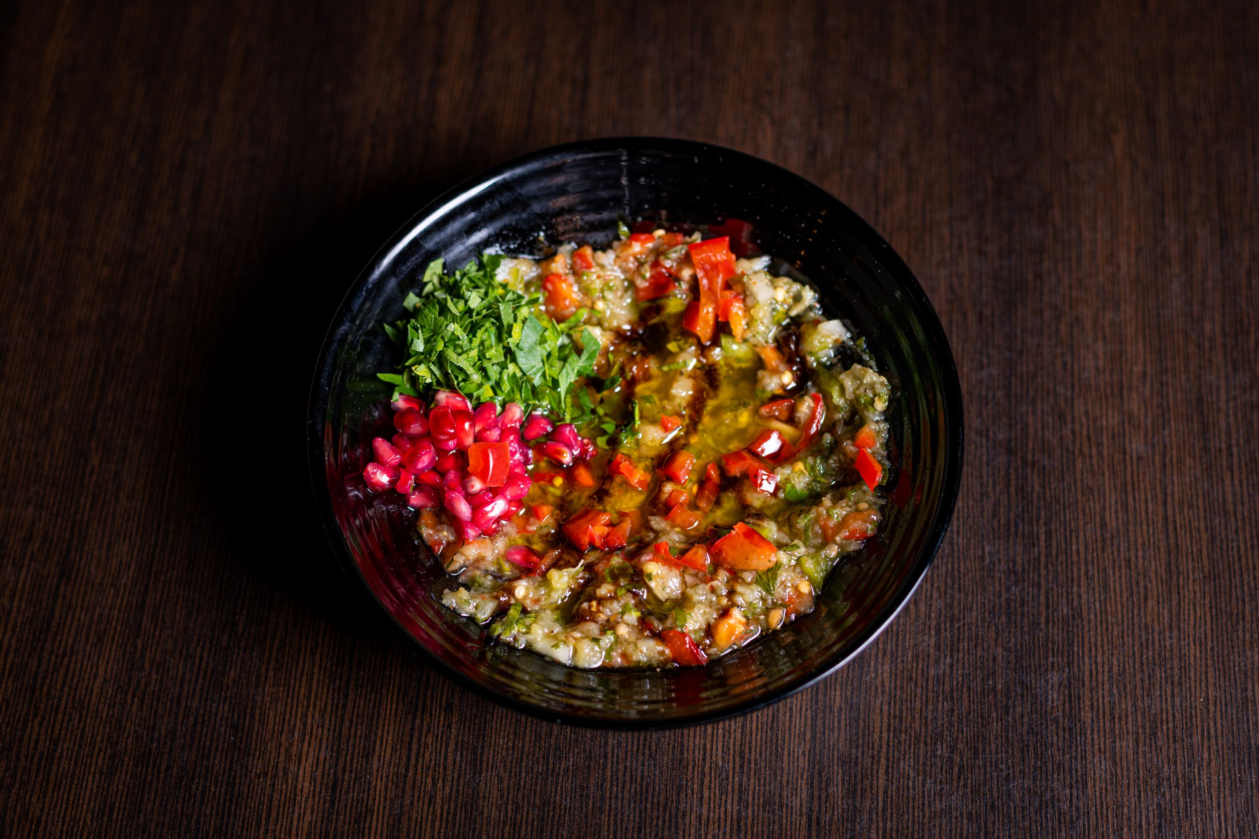 Paprikadipp blandet med valnøtter, pistasjnøtter, løk, tomater og søt chili