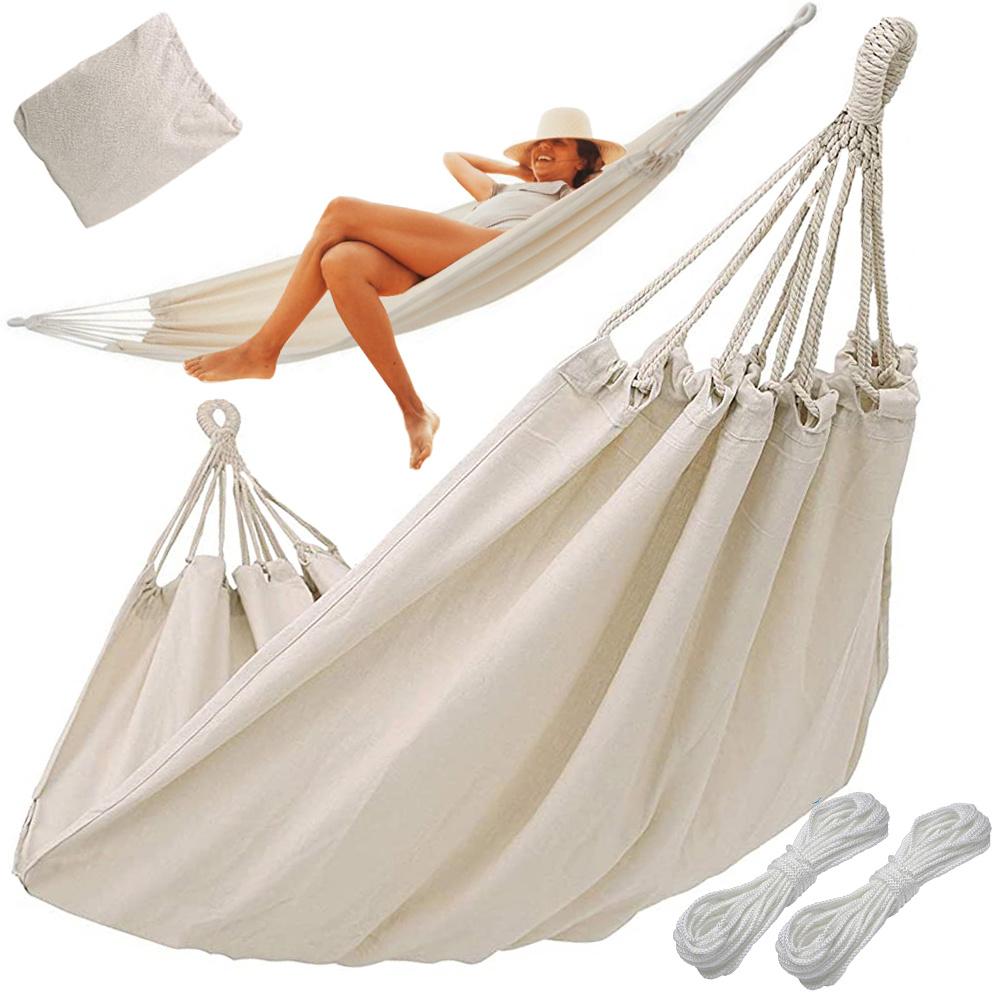 En hagehengekøye er den perfekte tingen for alle som liker å tilbringe fritiden sin i naturen. Bare bind de to endene av hengekøyen til trær eller solide stenger og nyt komforten. Settet kommer med to ledninger som vi kan fikse hengekøyen vår med. Du kan for eksempel lese en bok i den mens du svaier forsiktig i den myke hengekøyen.