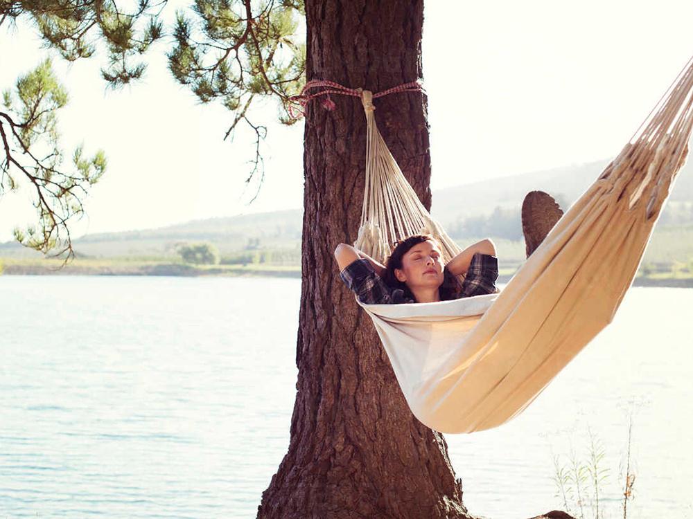 Hengekøyen kan henges hvor som helst. Bare bind de to endene til en stabil overflate som stolper, kroker eller trær.
