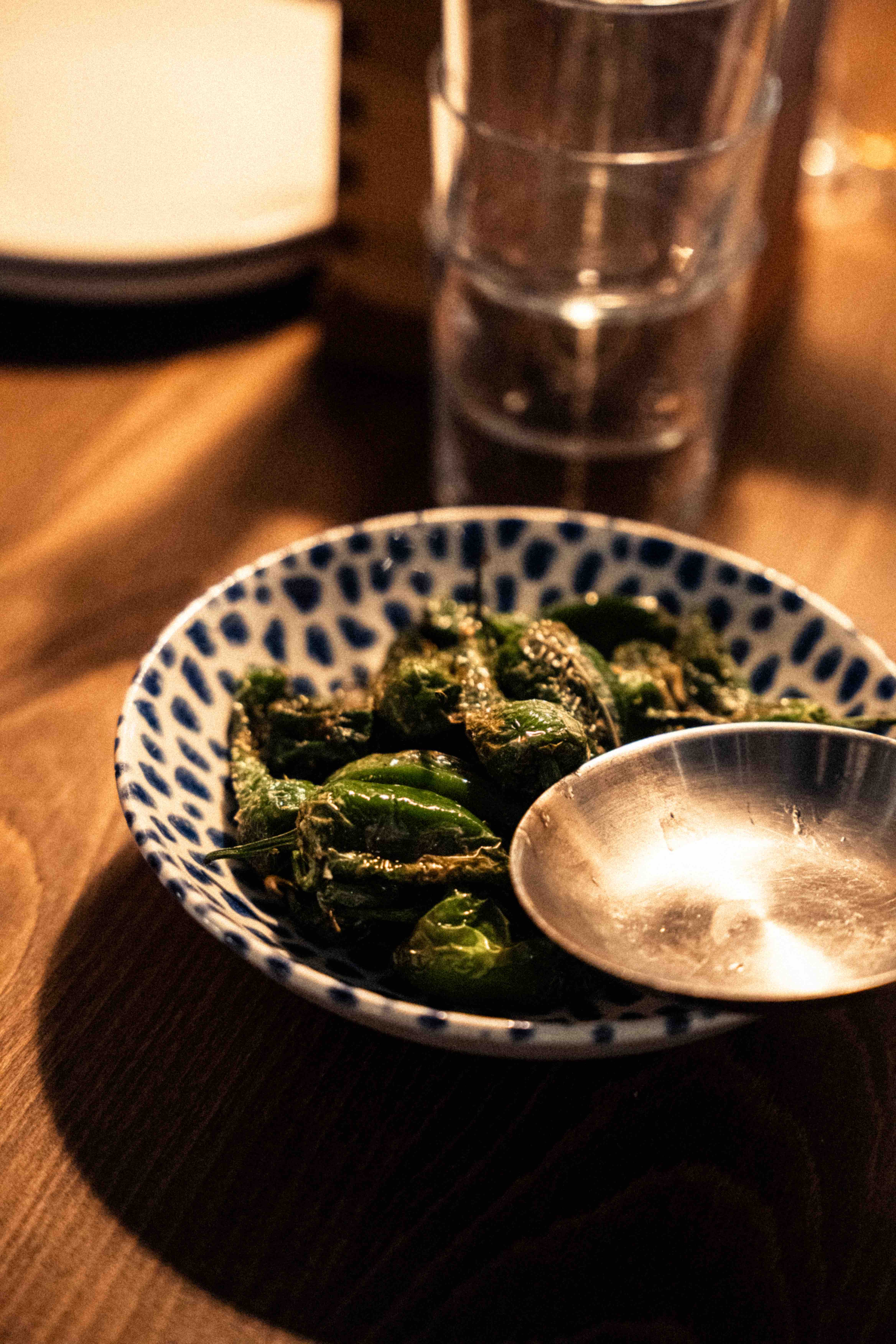 Lett grillede Padrón-paprikaer, vendt i olivenolje og flaksalt. - Teppeskjell – nam jim