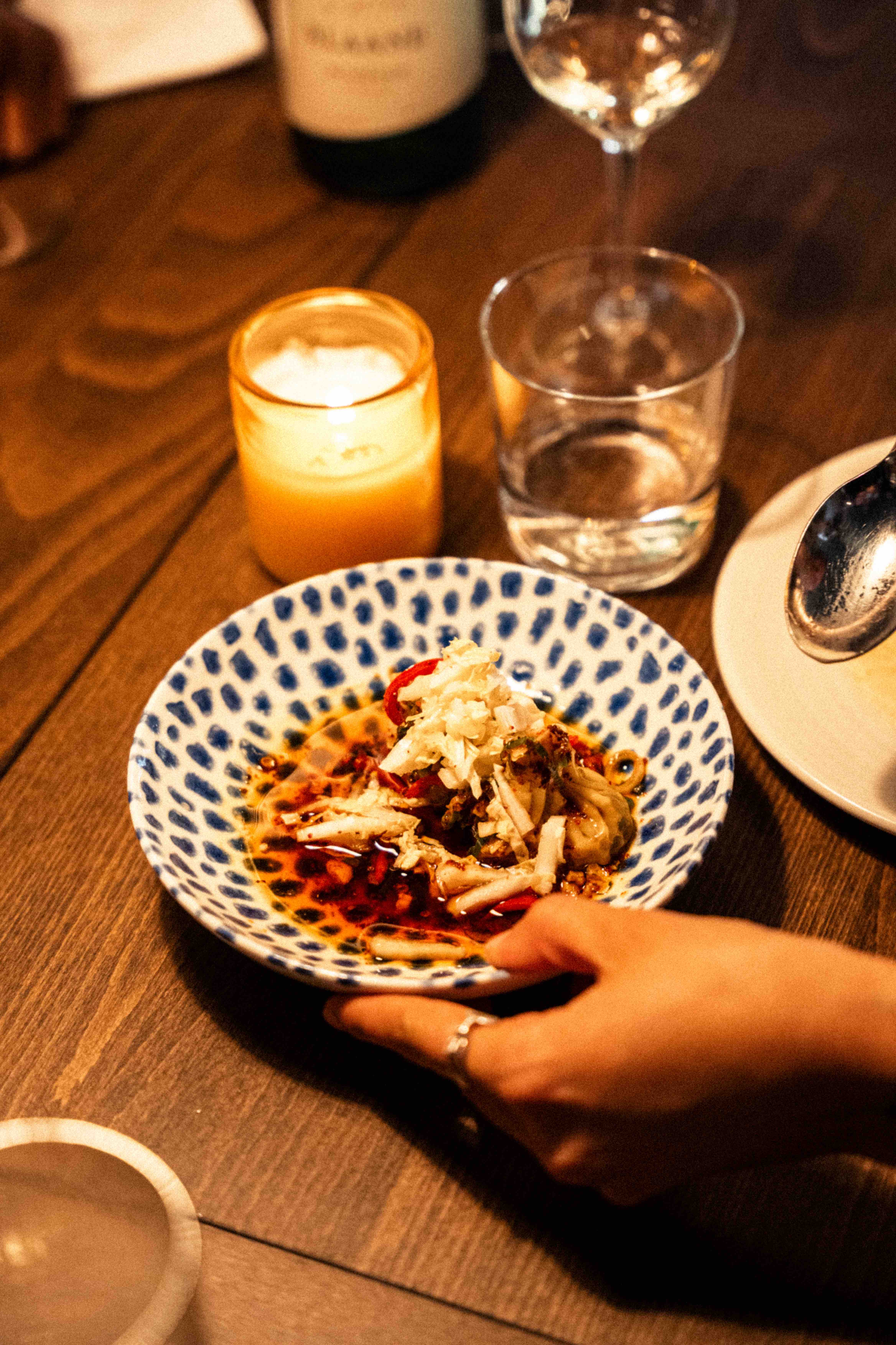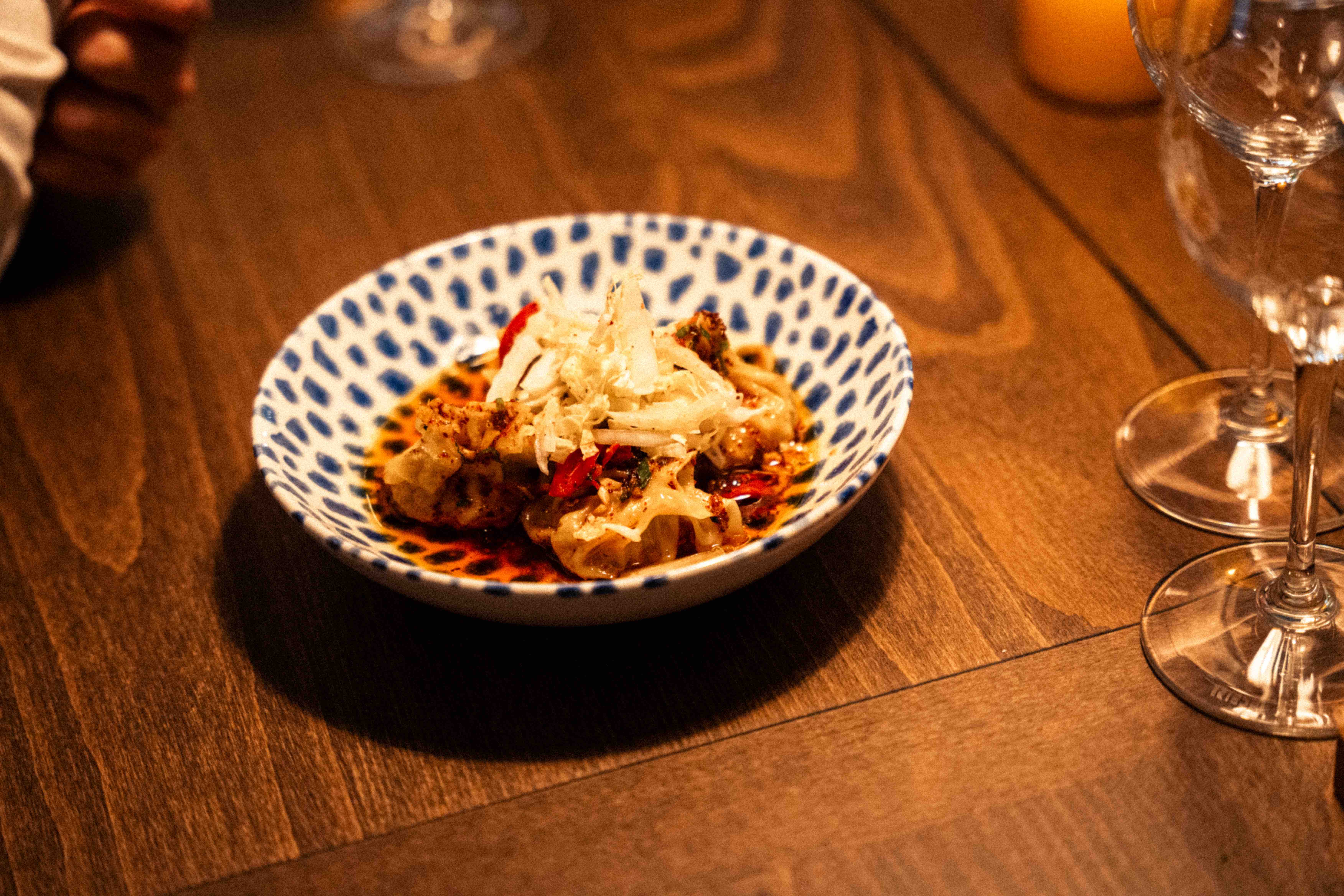 Kvelden starter lett og friskt med Pimientos de Padrón, før du får saftige teppeskjell med nam jim som gir et perfekt balansert sting av syre og krydder. Videre serveres delikate dumplings fylt med svin og reker, etterfulgt av mørt grillet oksehale i fyldig Sichuan-saus. Måltidet rundes av med vaniljeis toppet med salte mandler, en søt og elegant avslutning på en uforglemmelig smaksreise.