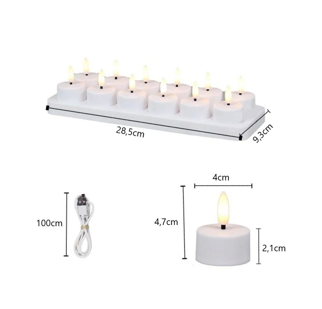 Lysene lades enkelt på den medfølgende basen via USB og gir en myk, varm glød som passer perfekt hjemme, på fest eller i restaurantmiljø. Takket være energibesparende LED-teknologi får du lang driftstid, miljøvennlig bruk og et trygt alternativ til vanlige stearinlys.