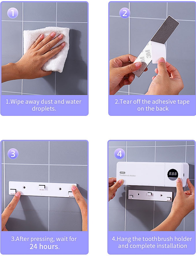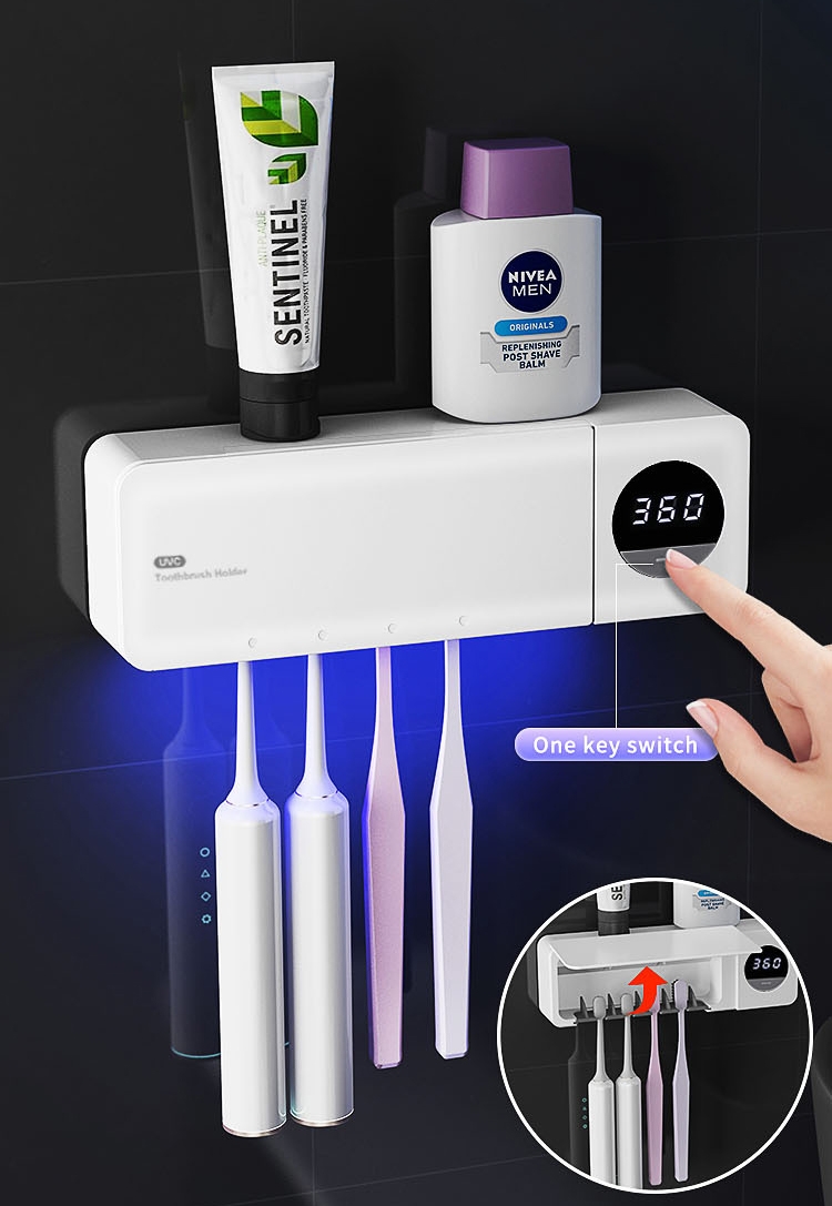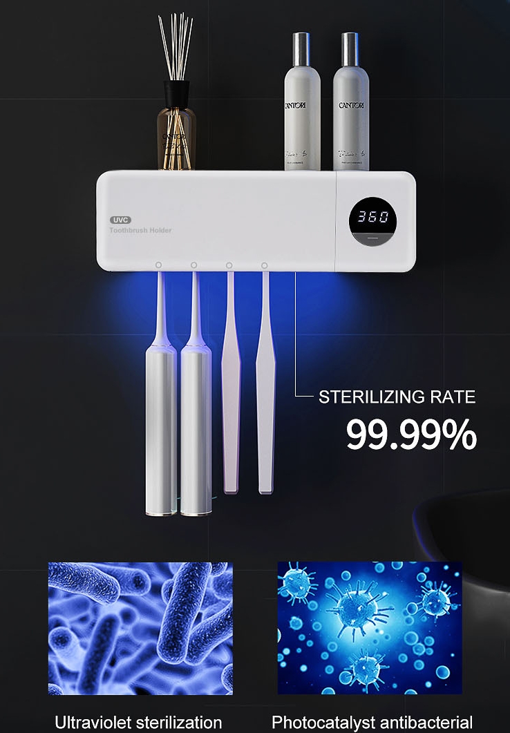 Den innebygde 360-sekunders timeren steriliserer tannbørstene automatisk, og lampen slås av umiddelbart når lokket åpnes for ekstra sikkerhet. Den lades via USB, er enkel å montere med medfølgende selvklebende teip og har plass til opptil fire tannbørster.
