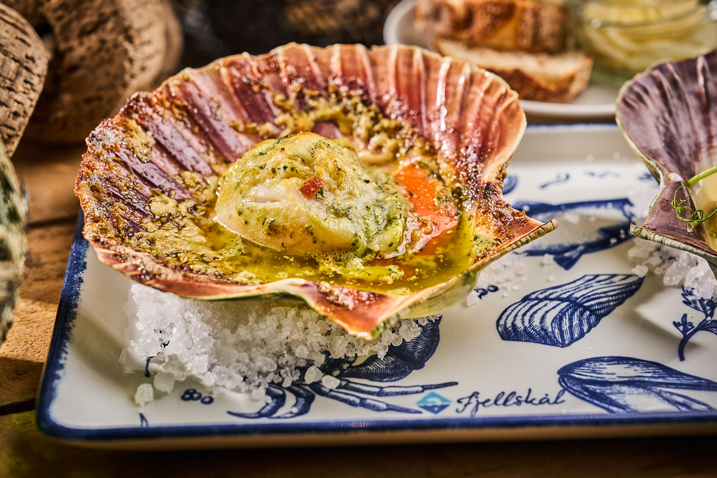 Gratinerte kamskjell i kjørvel- og estragonsmør med hvitløk og parmesan - Hovedrett: