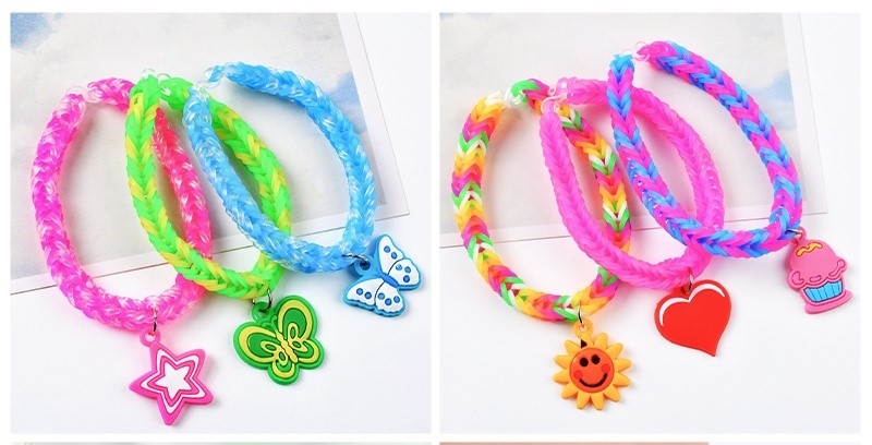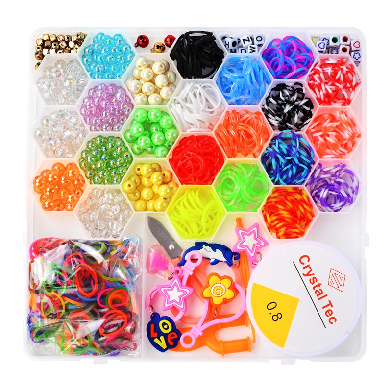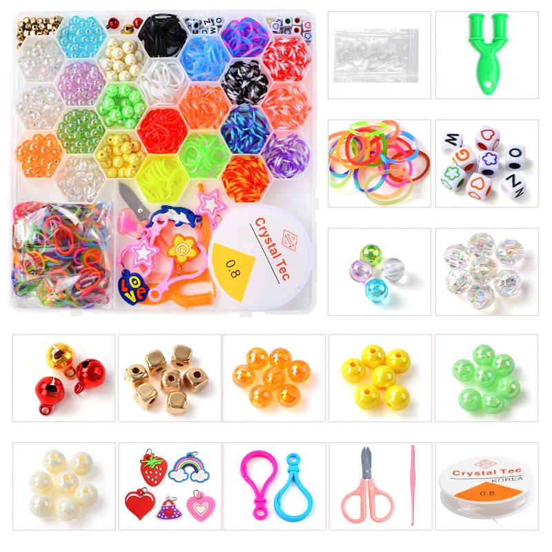 Hvorfor begrense deg til bare armbånd når du kan la fantasien din flyte fritt og skape utrolige kunstverk? Vårt sett inneholder gummistrikk i livlige og vakre farger, heklekroker, klokker, dekorative elementer og anheng for å gi deg det perfekte settet med verktøy for å lage kunstverk.