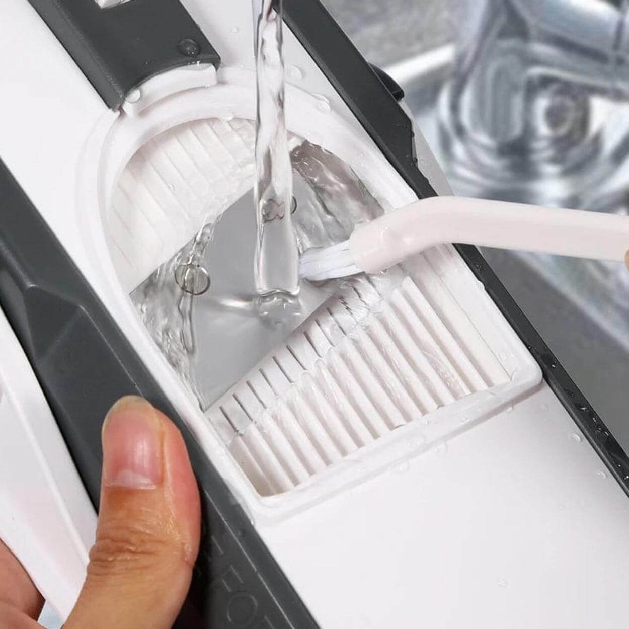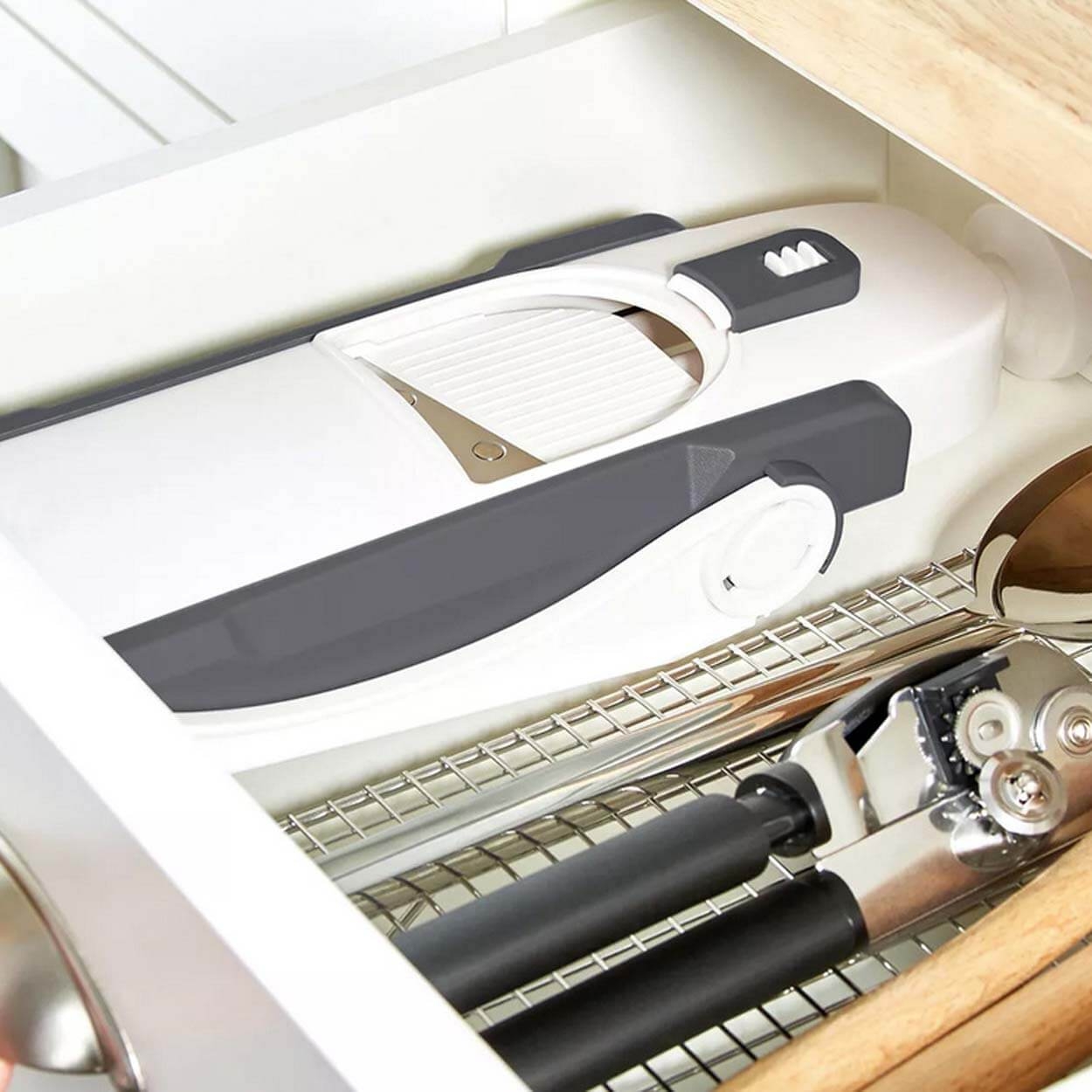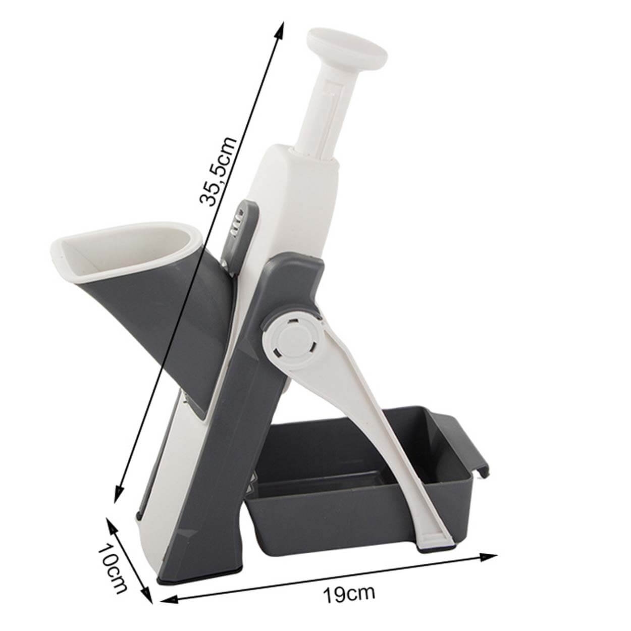 Den kompakte utformingen gjør kutteren enkel å oppbevare, og den medfølgende beholderen holder kjøkkenbenken ryddig. Enten du lager hjemmelagde pommes frites, friske salater eller dekorative grønnsakspynt, er dette verktøyet for deg!