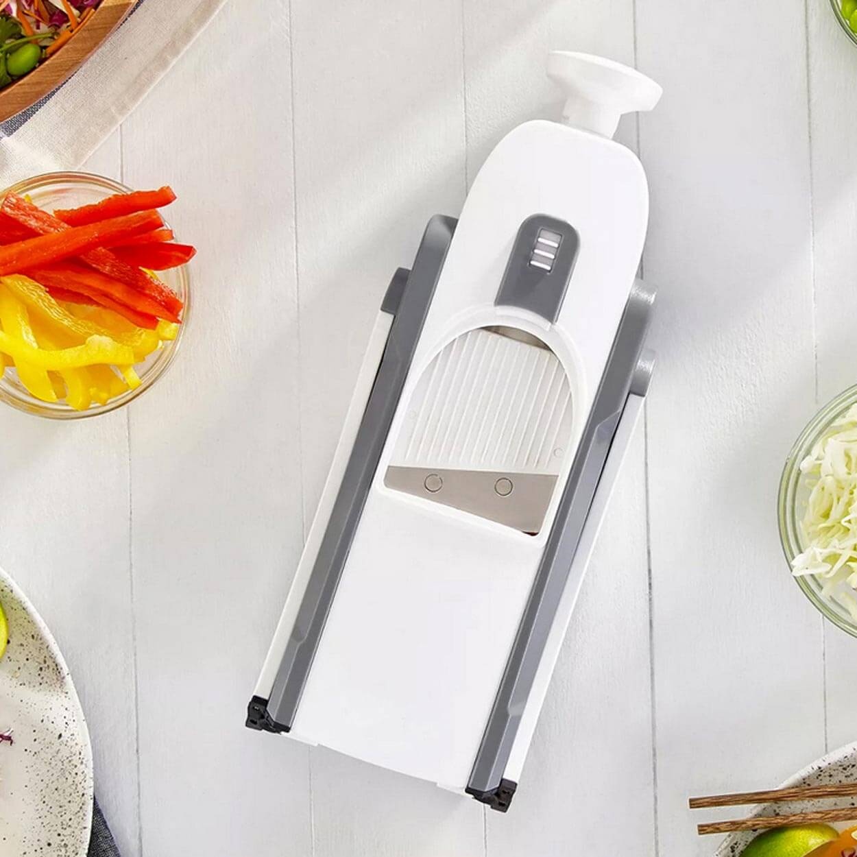 - Flere skjærealternativer: tynne strimler, tykke fries og klassiske skiver.