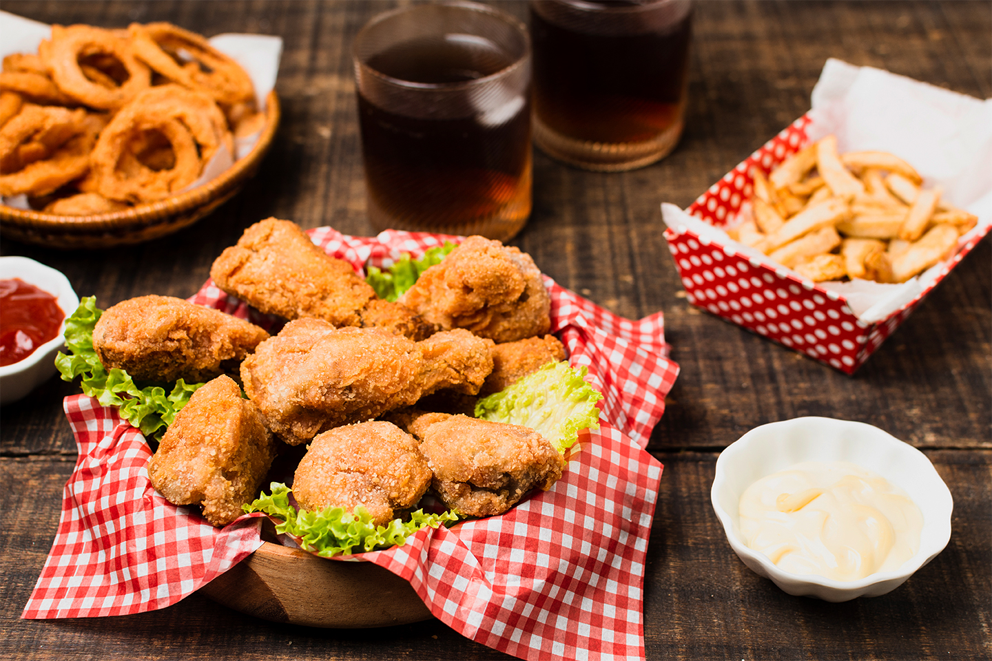 - 5 stk av hver: Hot Wings, mozzarella sticks, chilli cheese bites og onion rings