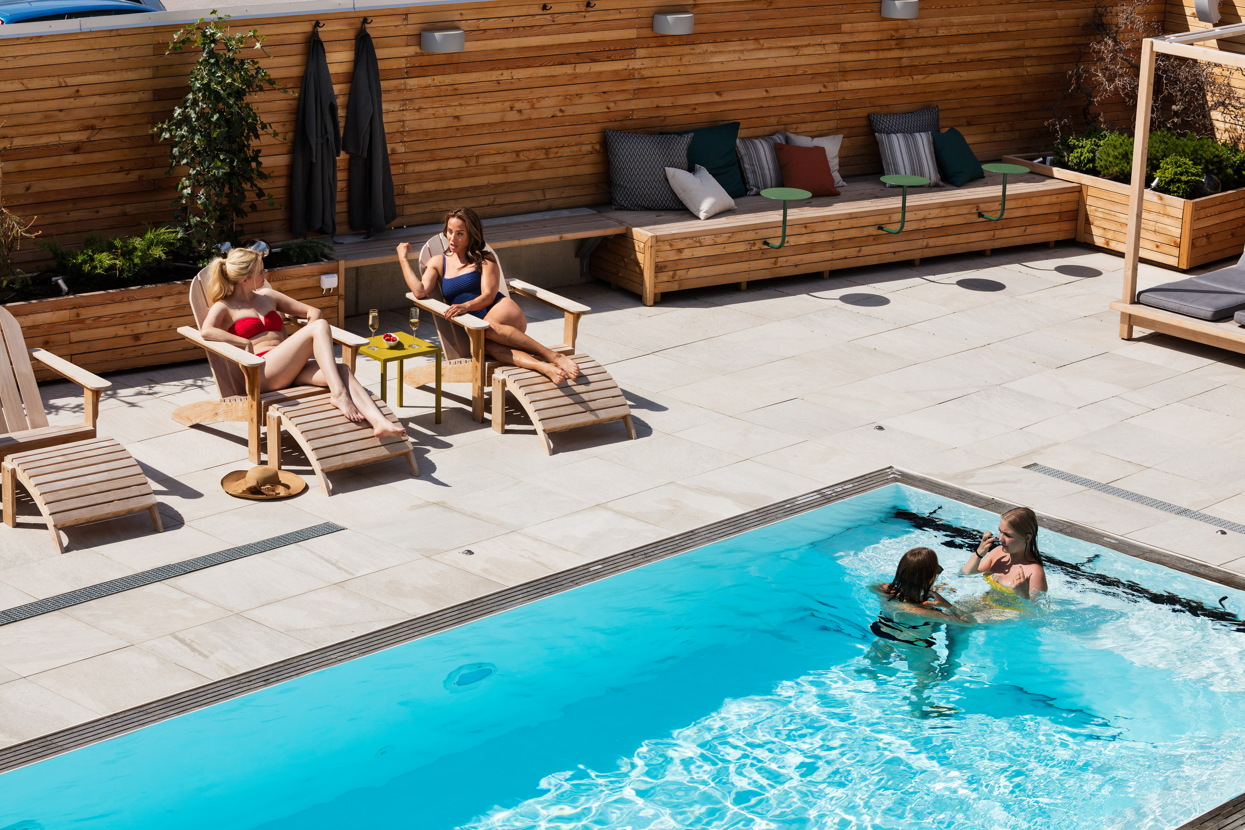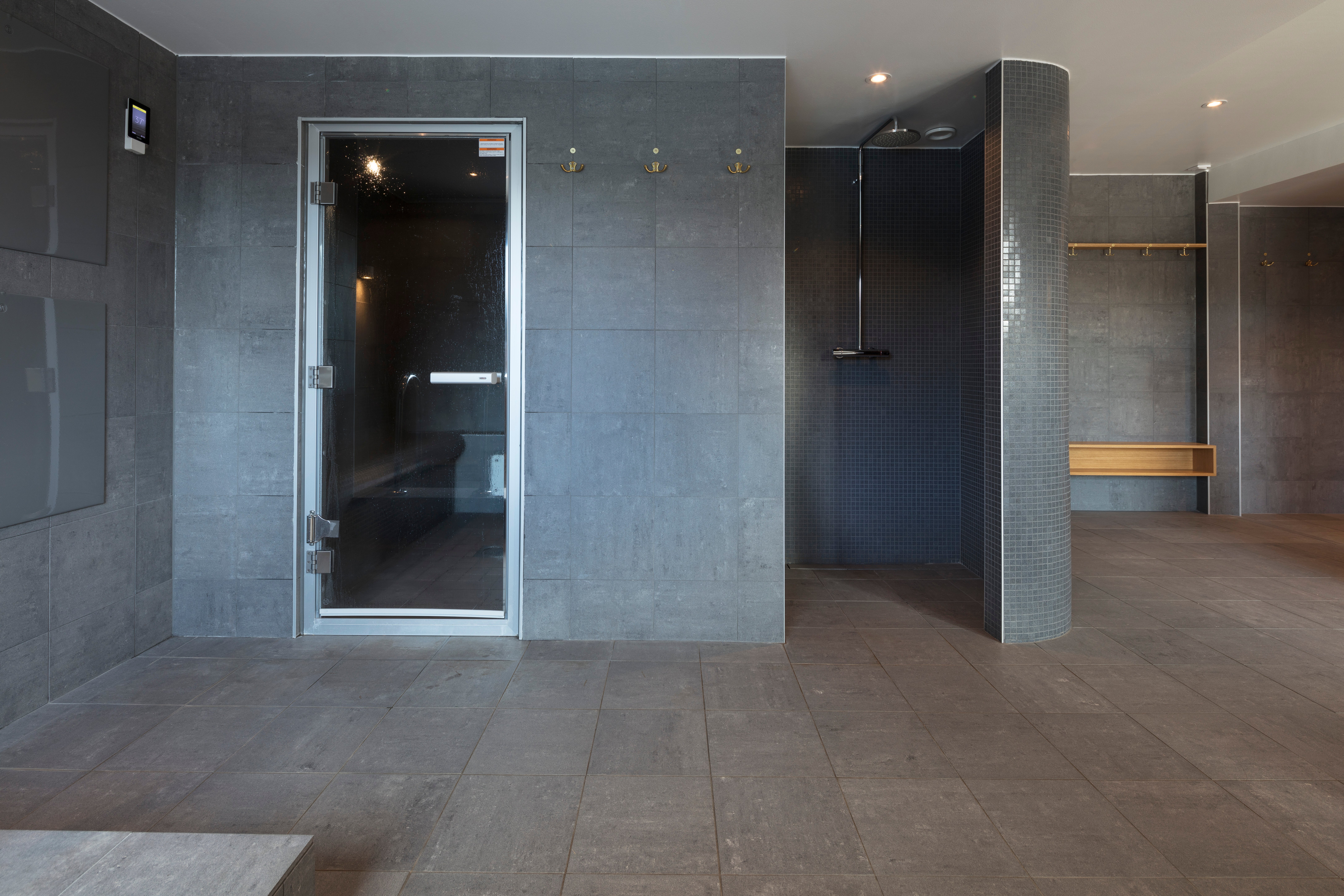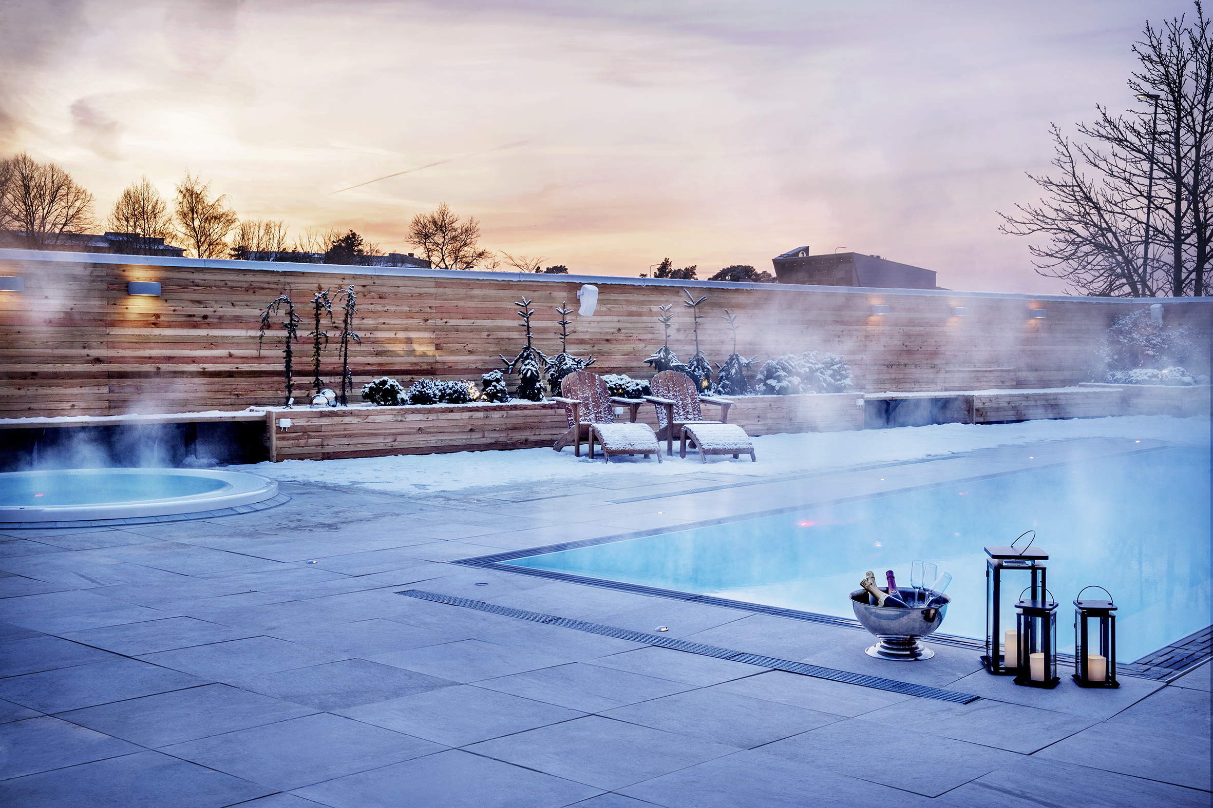 - Inngang til spa med stort oppvarmet utendørsbasseng, boblebad og divaner, tørr- og dampbadstue og isbad