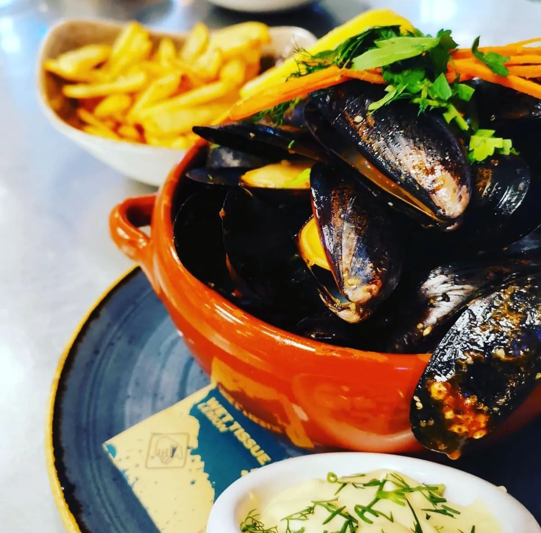 Velg mellom deilig dampede Blåskjell, Fish'n Chips eller Burger med fries hos Riviera Restaurant