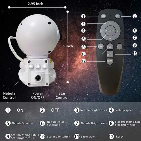 Prosjektets hode kan roteres 360 grader, slik at du kan endre retningen på lysene akkurat som du vil . Med fjernkontrollen kan du også justere fargen på tåken, nebulas lysstyrke, nebulas hastighet, stjernenes lysposisjon, stjernenes lyshet, stjernenes hastighet og slå av/på stjernen Stjerner.