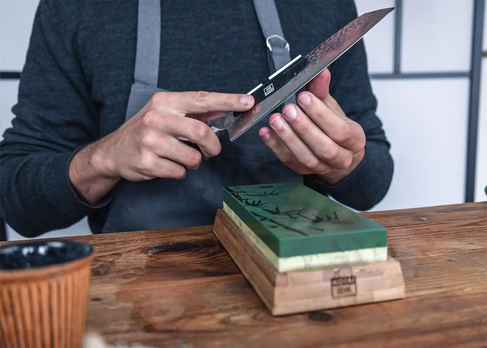 Kotai-kniver er slipt til en dobbel skråkantsliping som gir eggen en optimal vinkel på 15° per side (mot 20–25° for de fleste vestlige kniver), og balanserer perfekt ekstrem skarphet og bladets soliditet.