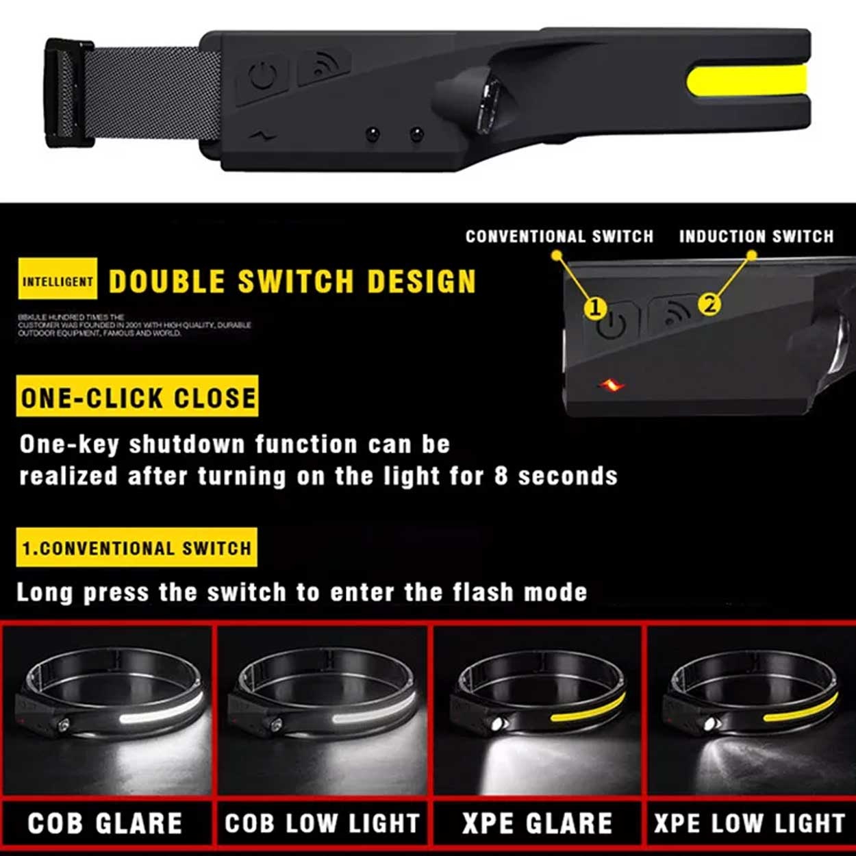Lysmodus: 5 moduser (COB, COB low, XPE, XPE low, SOS)