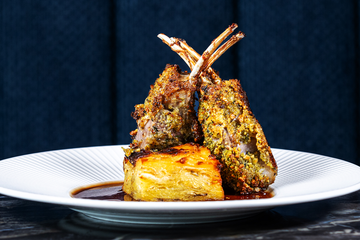 - Lammecarré - serveres med rødvinsaus, pommes anna, gressløk og brokkolini