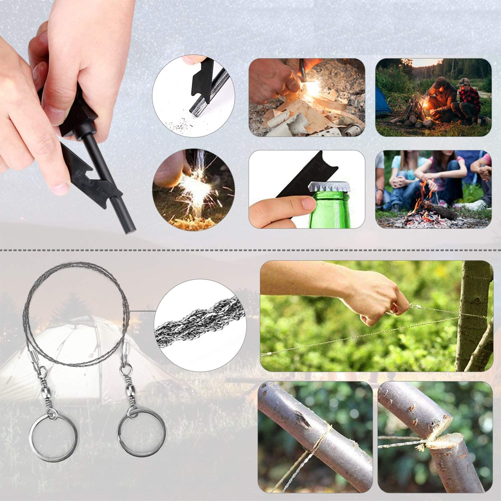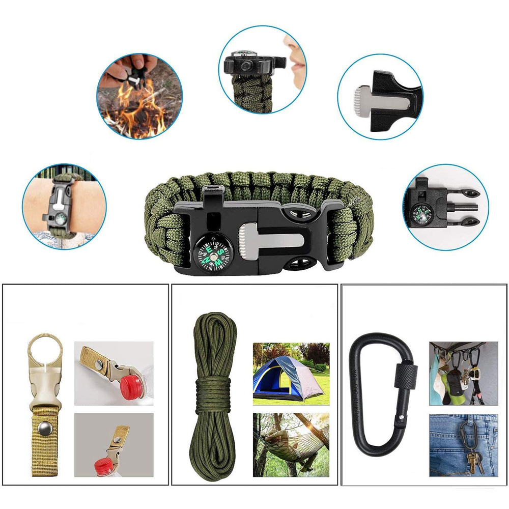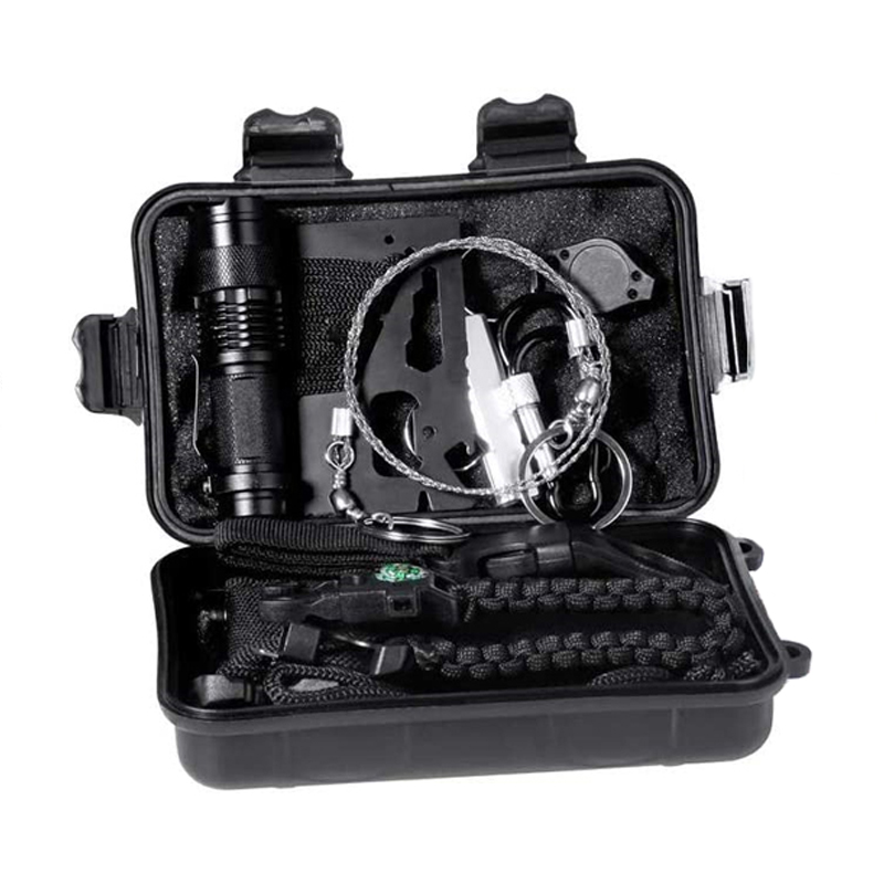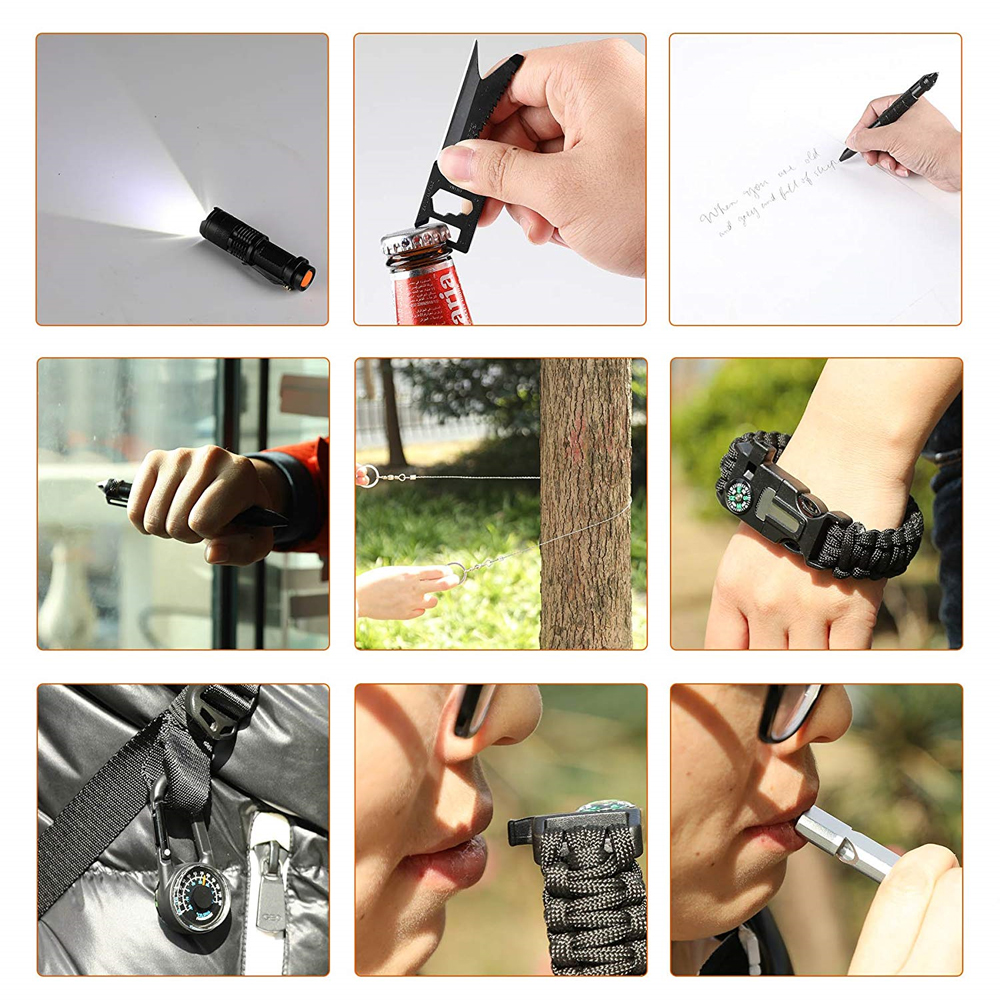 Et flerbruks overlevelsessett for alle friluftsentusiaster, inneholder gadgets for å løse de fleste oppgaver du kan møte når noe går galt eller hvis du er i fare. Med dette nødutstyret får du verktøy som en minilommelykt, multifunksjonskniv, brannstål, trådsag, taktisk penn med glassknuser, multifunksjonelt armbånd med både kompass, fløyte og tent stål, verktøykort og mye mer.