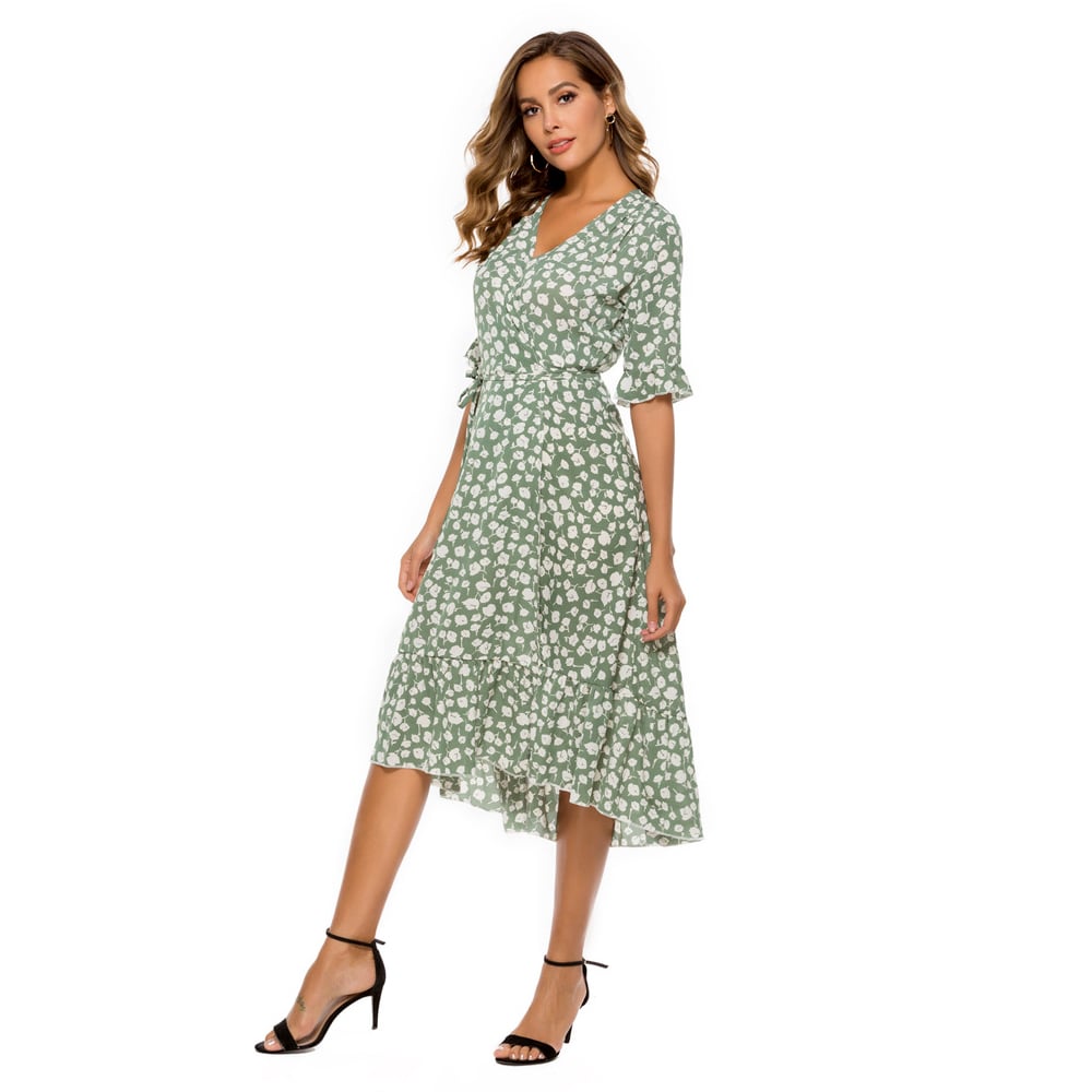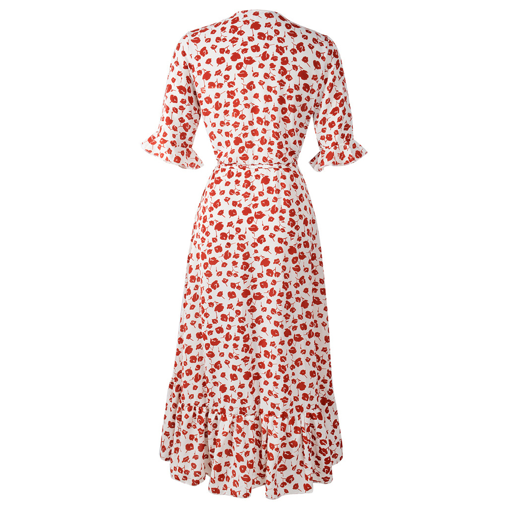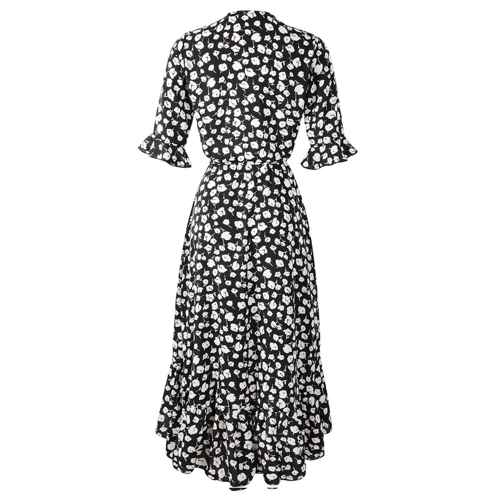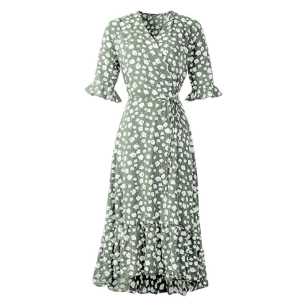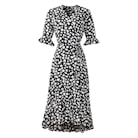Lett og godt tilpasset sommerkjole med blomstermønster. Kjolen har en avsmalnet midje med snor som gir en smigrende silhuett. Kjolen har ingen glidelåser eller knapper som sitter på steder som er vanskelig å nå. Den har halvlange ermer og er litt lengre bak enn foran.