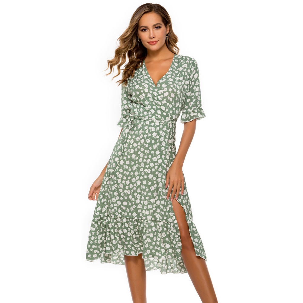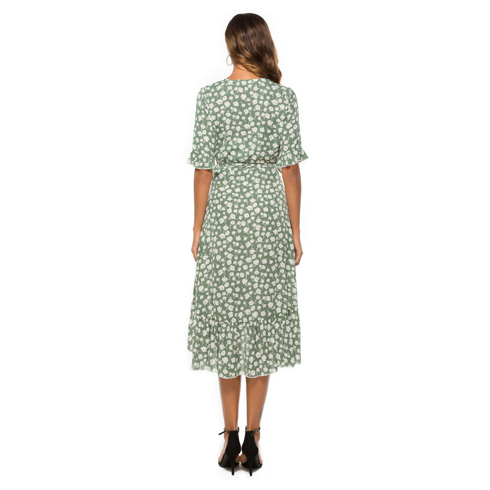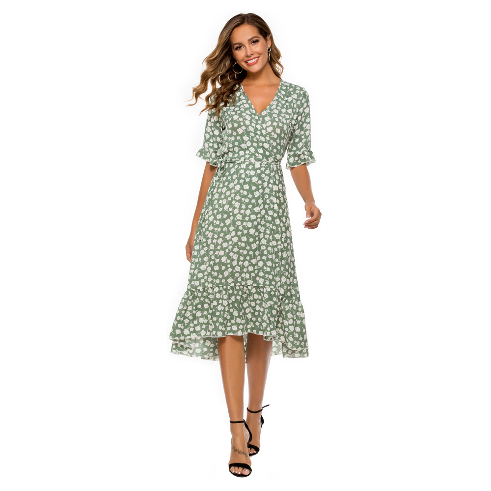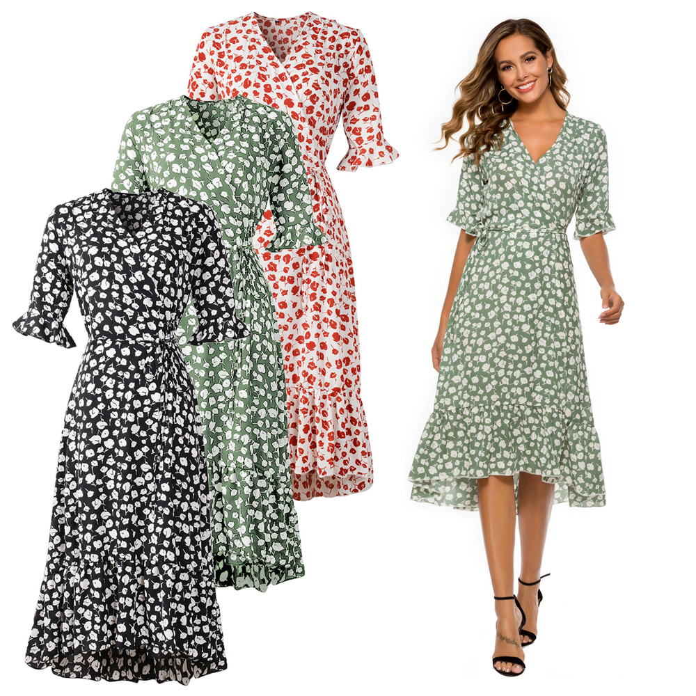Lett og godt tilpasset sommerkjole med blomstermønster. Kjolen har en avsmalnet midje med snor som gir en smigrende silhuett. Kjolen har ingen glidelåser eller knapper som sitter på steder som er vanskelig å nå. Den har halvlange ermer og er litt lengre bak enn foran.