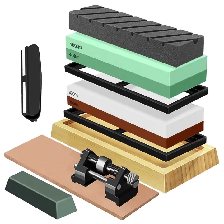Dette slipesettet inneholder alt som trengs for å gi knivene dine en profesjonell skarphet. Med fire kombinerte slipe- og brynesteiner, fra grovsliping til finpolering, sikres en jevn og skarp egg. Steinene skal bløtlegges før bruk for å optimalisere slipingen og beskytte knivbladet. For ekstra stabilitet medfølger et sklisikkert bambusunderlag og gummiunderlag, noe som gjør slipingen både trygg og smidig.