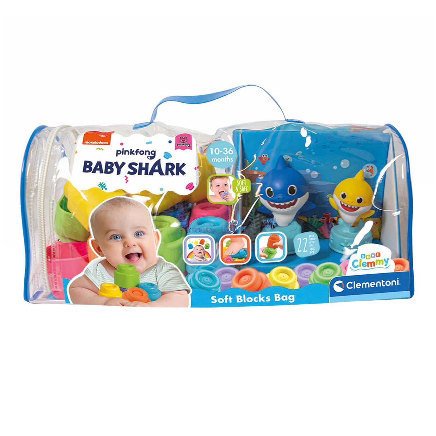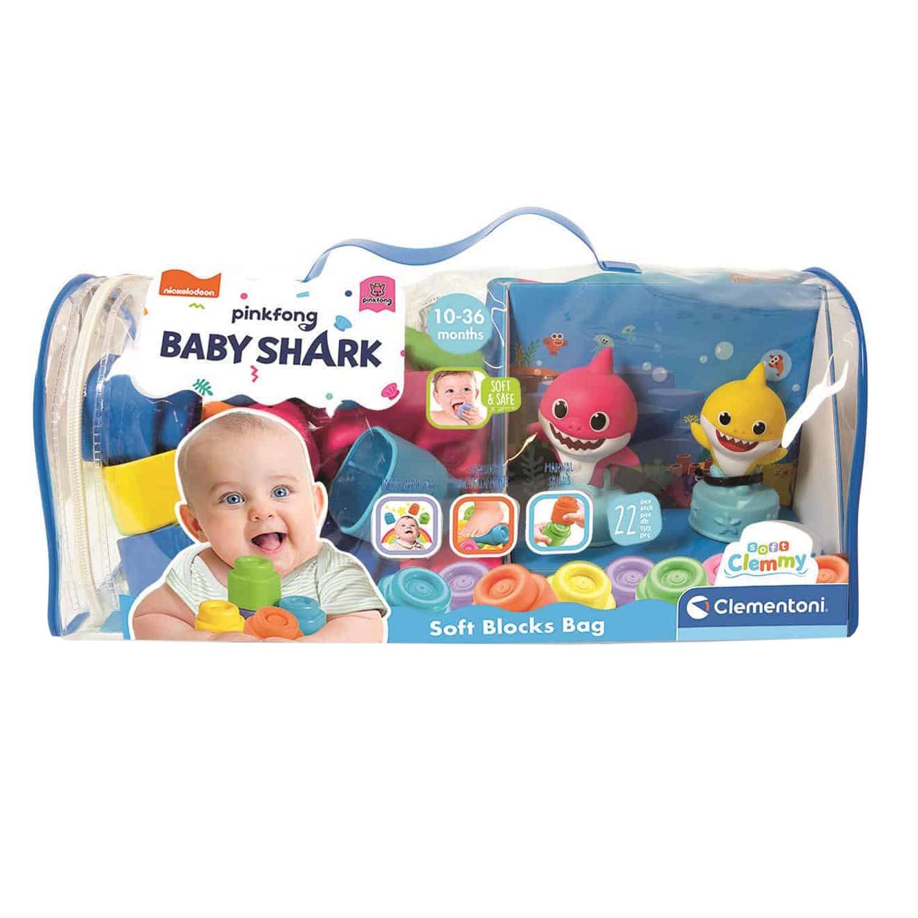 Hjelp barnet ditt med å utvikle fantasien og motoriske ferdigheter med disse myke Clemmy-klossene i plast. Klossene er enkle og morsomme å bygge med og barnet ditt risikerer ikke å skade seg på skarpe kanter. Klossene kommer i en praktisk veske i myk plast som kan bæres overalt. Vesken inneholder 20 myke singel- og dobbelklosser samt 2 Baby Shark-karakterer.