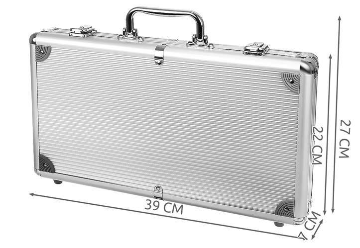 Settet har 300 brikker i fem forskjellige farger, to kortstokker og alle nødvendige blind- og dealerbrikker samt terninger. Alt ligger i en stilren aluminiumskoffert med håndtak, lås og nøkkel for sikker oppbevaring. Perfekt for både hjemmekvelder og pokerturneringer.