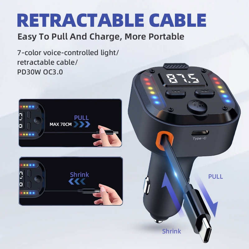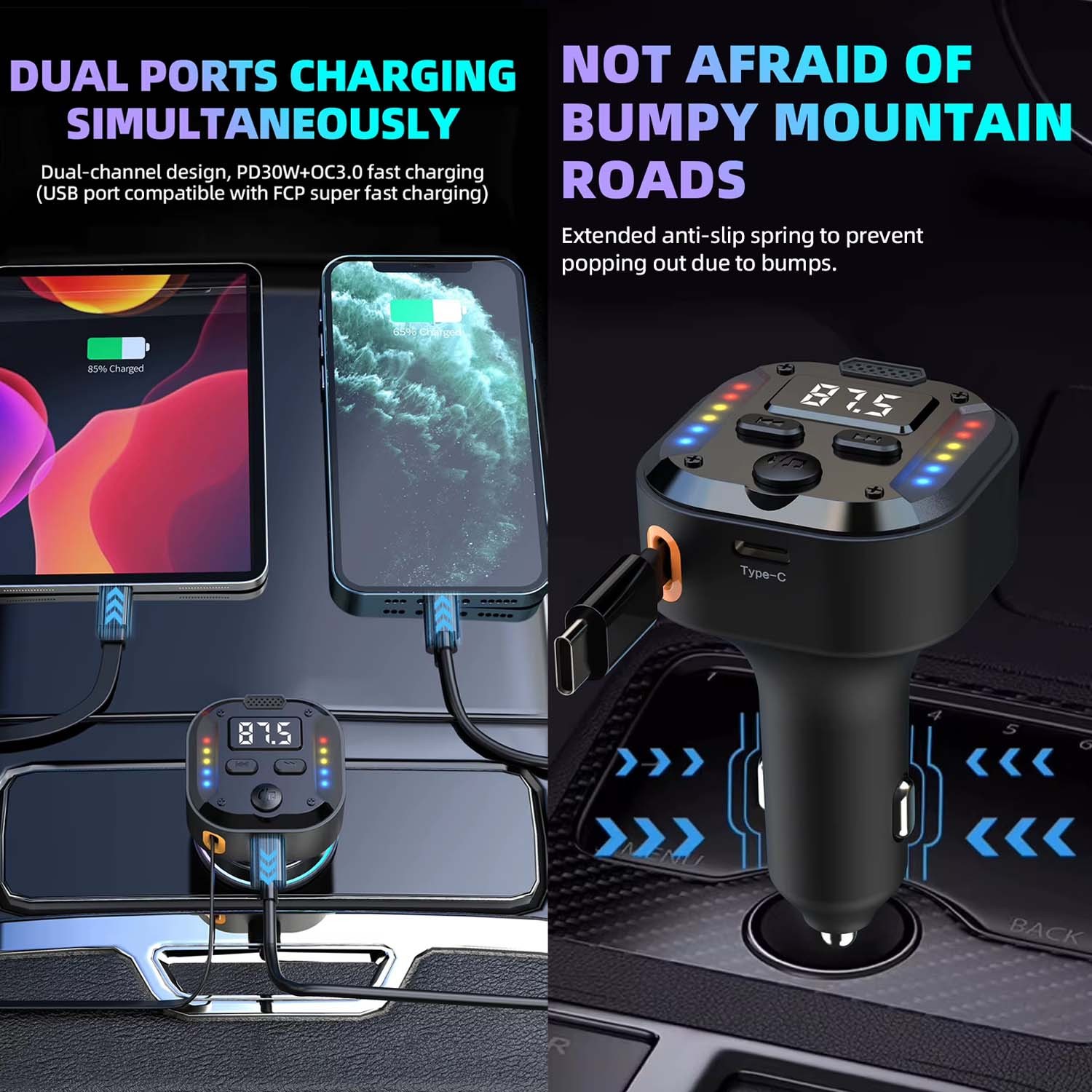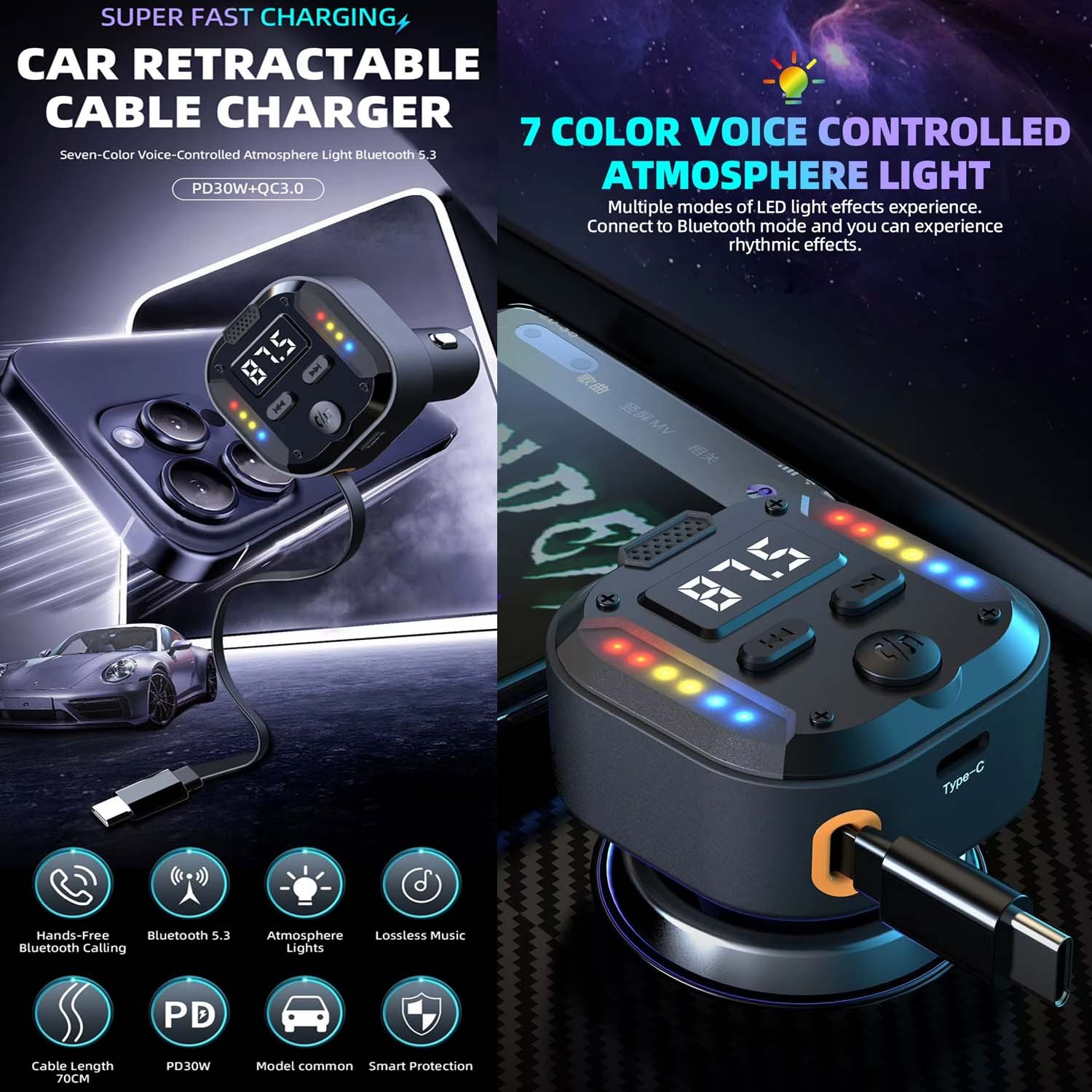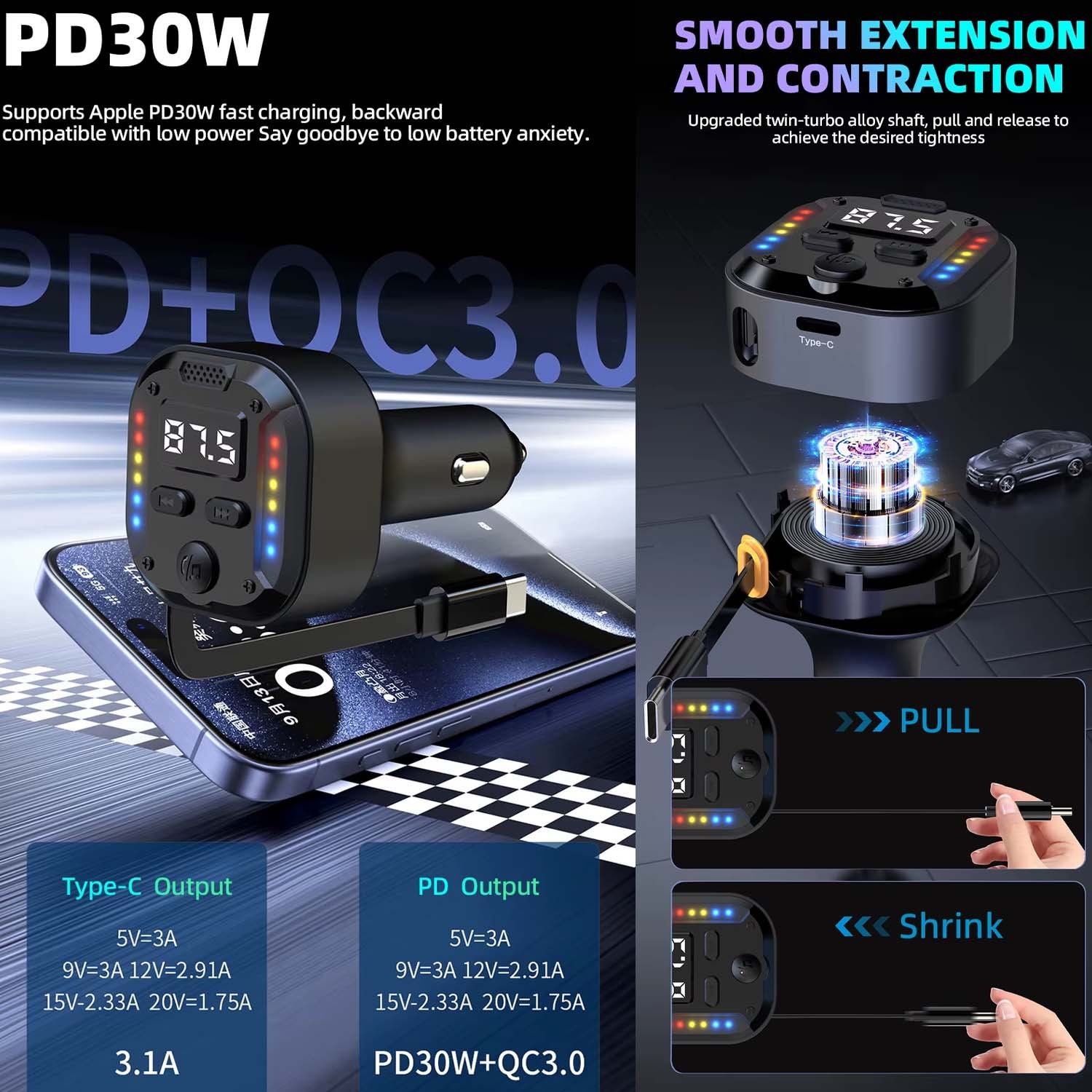 Dobbelt Type-C FM-sender og hurtiglader for bil – Bluetooth 5.3, PD 30 W + QC 3.0, RGB-lys og innebygd kabel