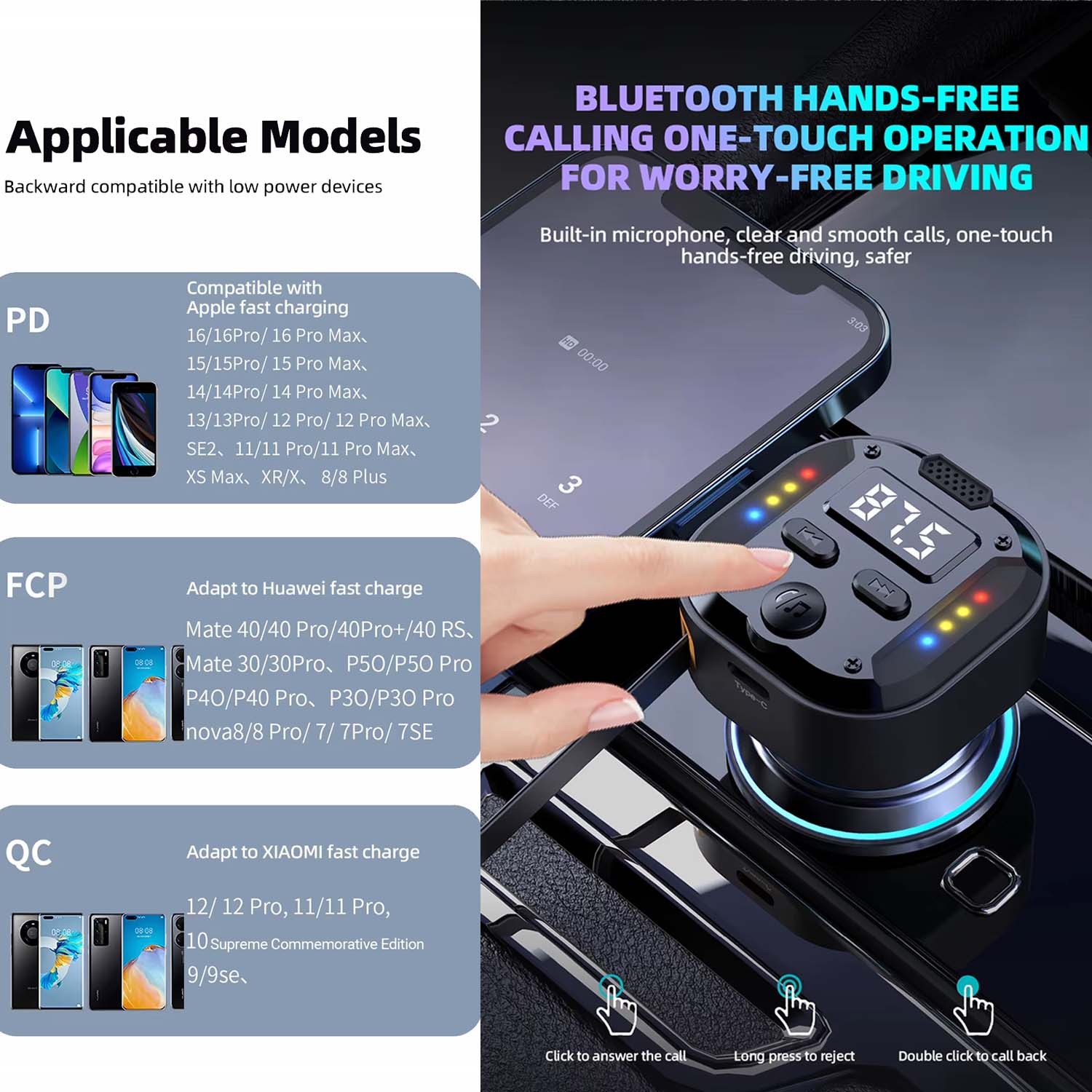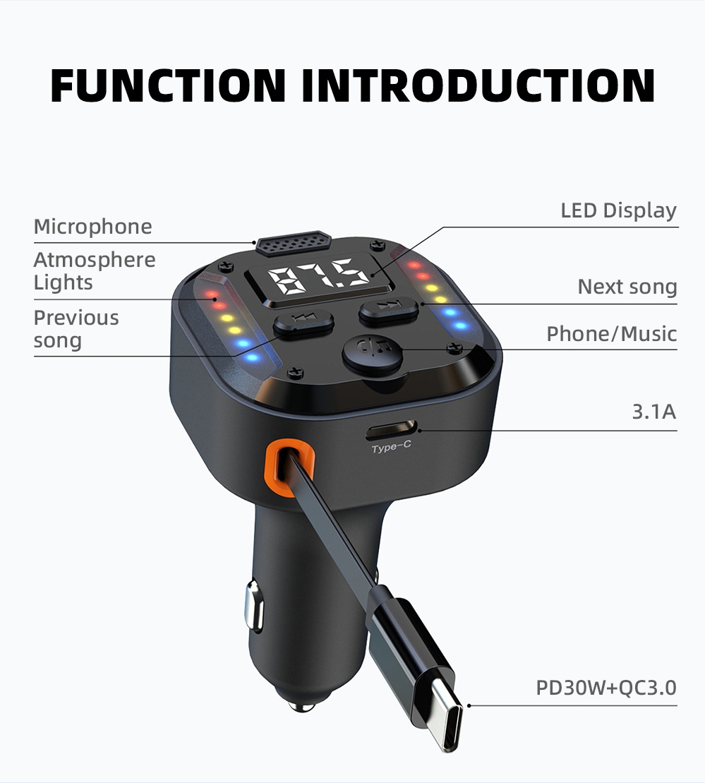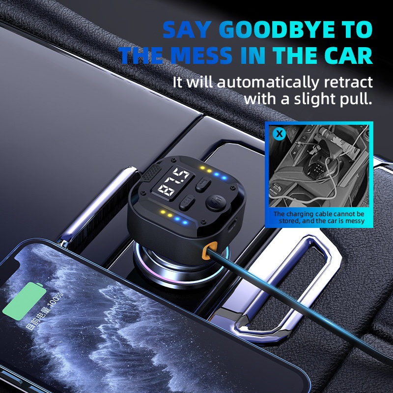 Denne multifunksjonelle biladapteren kombinerer FM-sender, Bluetooth 5.3 handsfree og doble raske Type-C (1 port og 1 innebygd kabel PD30W + QC3.0) i et kompakt format. Perfekt for kjøreturer der du vil spille musikk fra telefonen, ringe trygt uten hender og hurtiglade to enheter samtidig. Den innebygde digitale skjermen viser status mens RGB-lyset gir en stilig aksent i bilen. Uttrekkbar kabel gjør den enkel å bruke og holde ryddig i kupeen. Med flere beskyttelser (OVP, OCP, OTP, kortslutningsbeskyttelse) får du trygg lading, og støtte for både 12V og 24V gjør den egnet for personbil og lastebil.